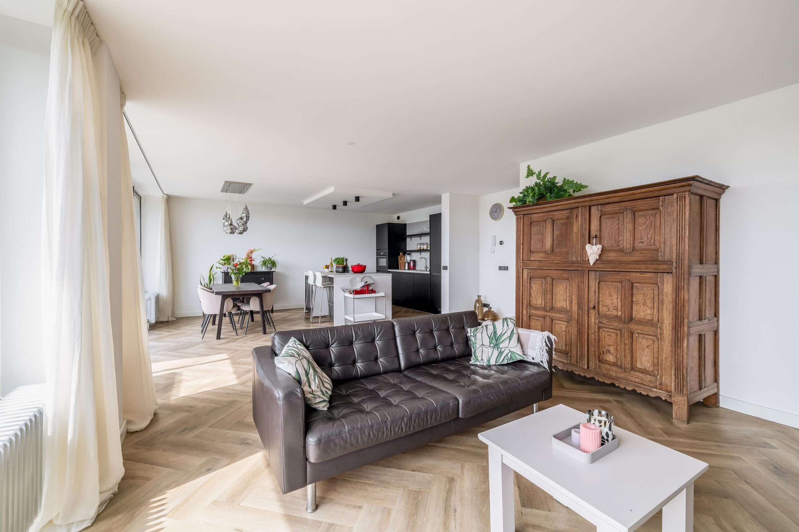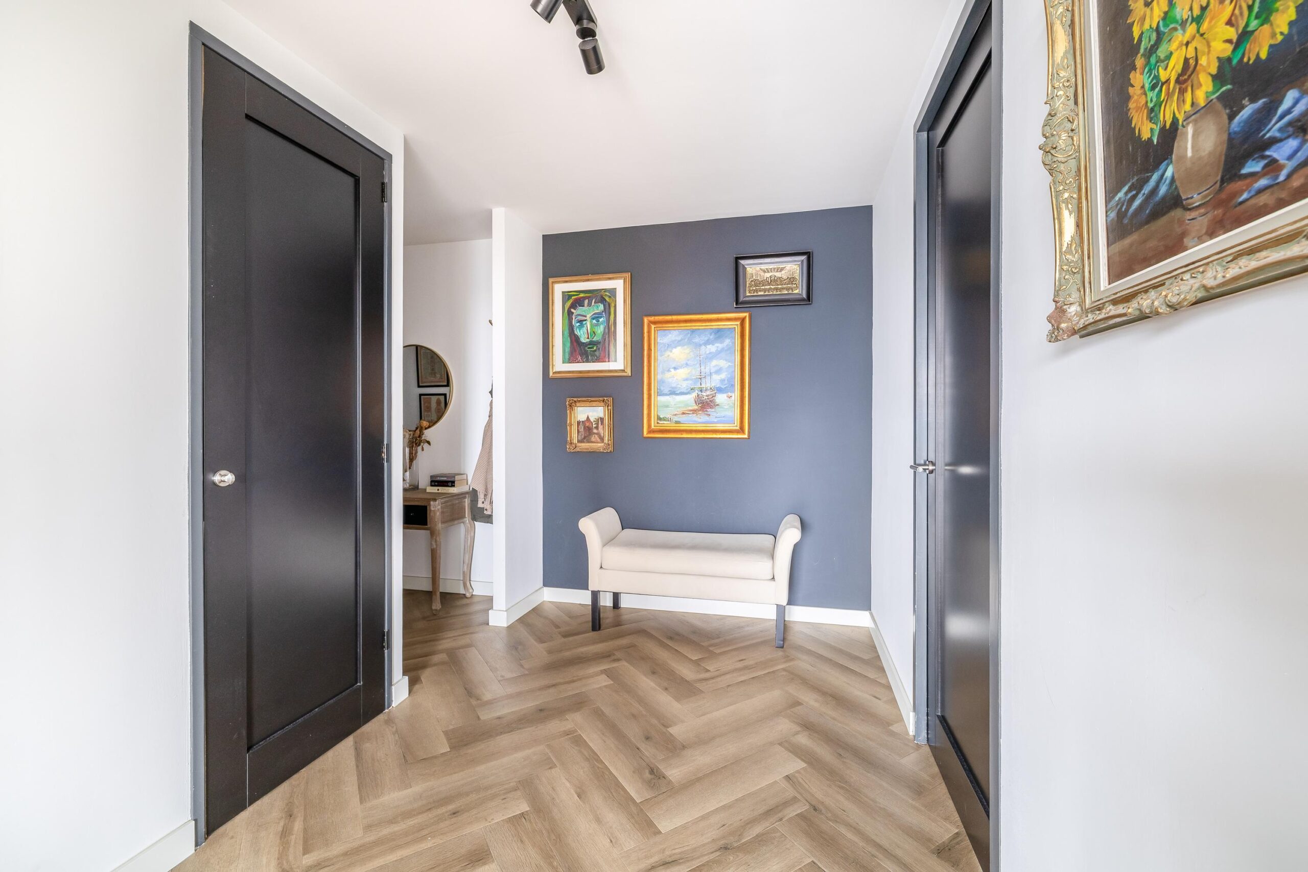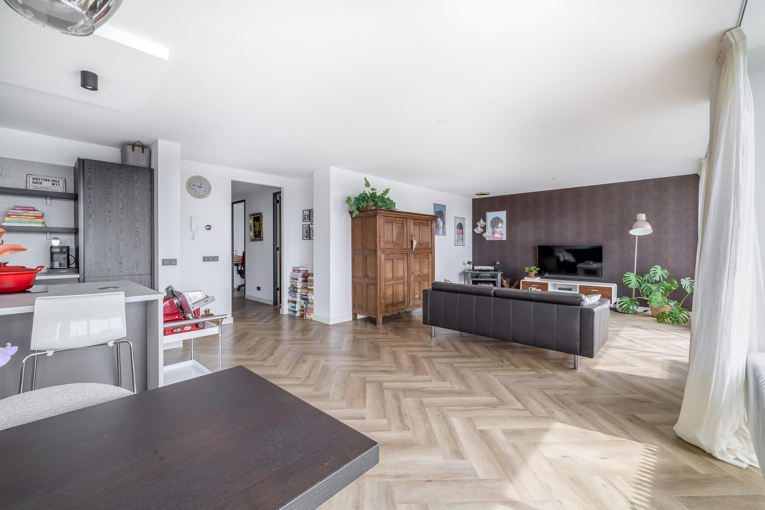 Het gehele appartement is afgewerkt met een hoogwaardige PVC-vloer in visgraatmotief, wat zorgt voor een warme en eigentijdse uitstraling.