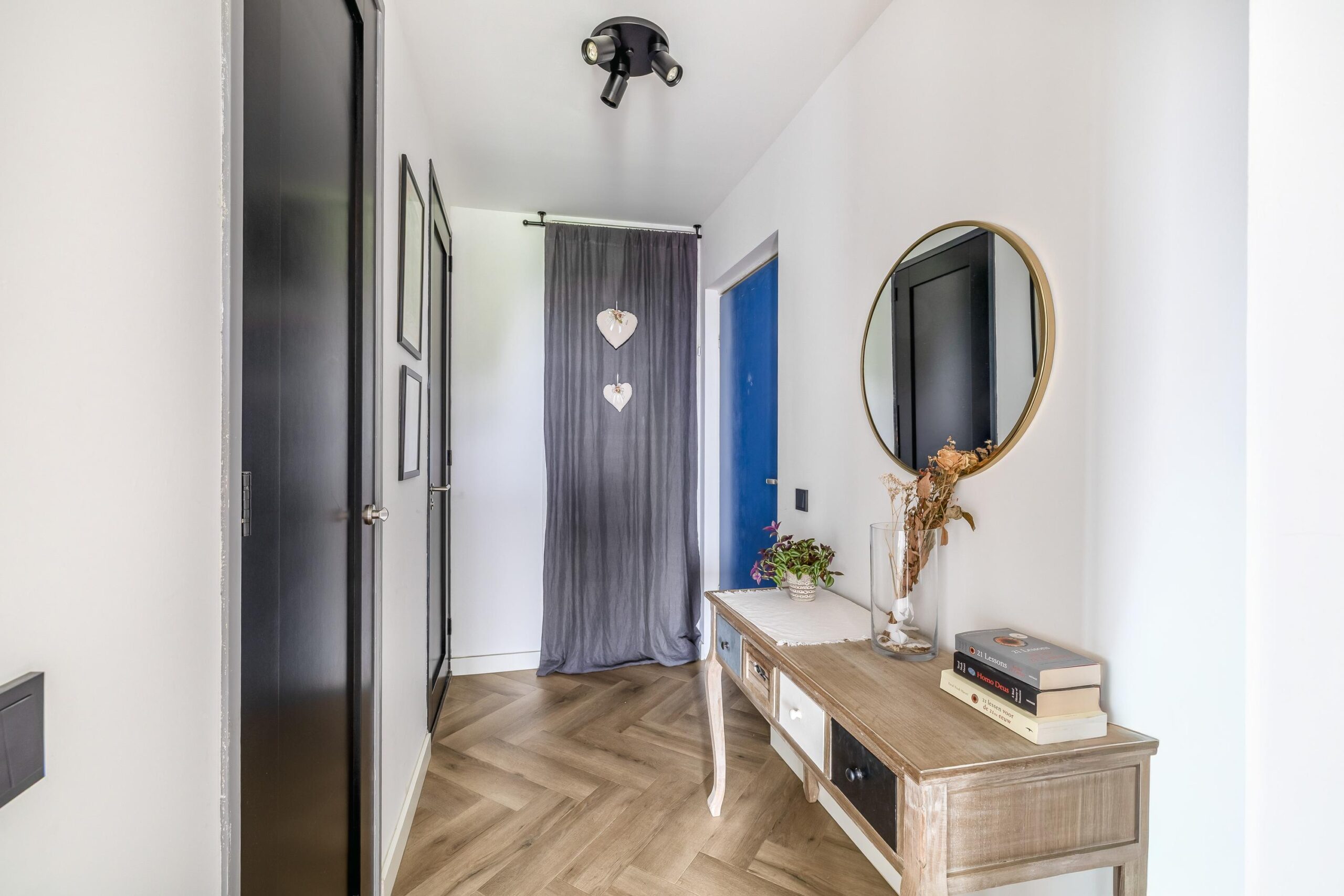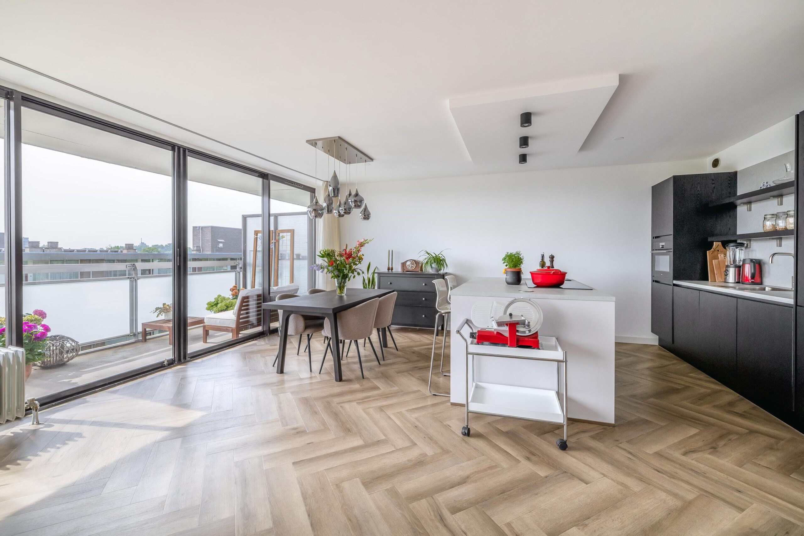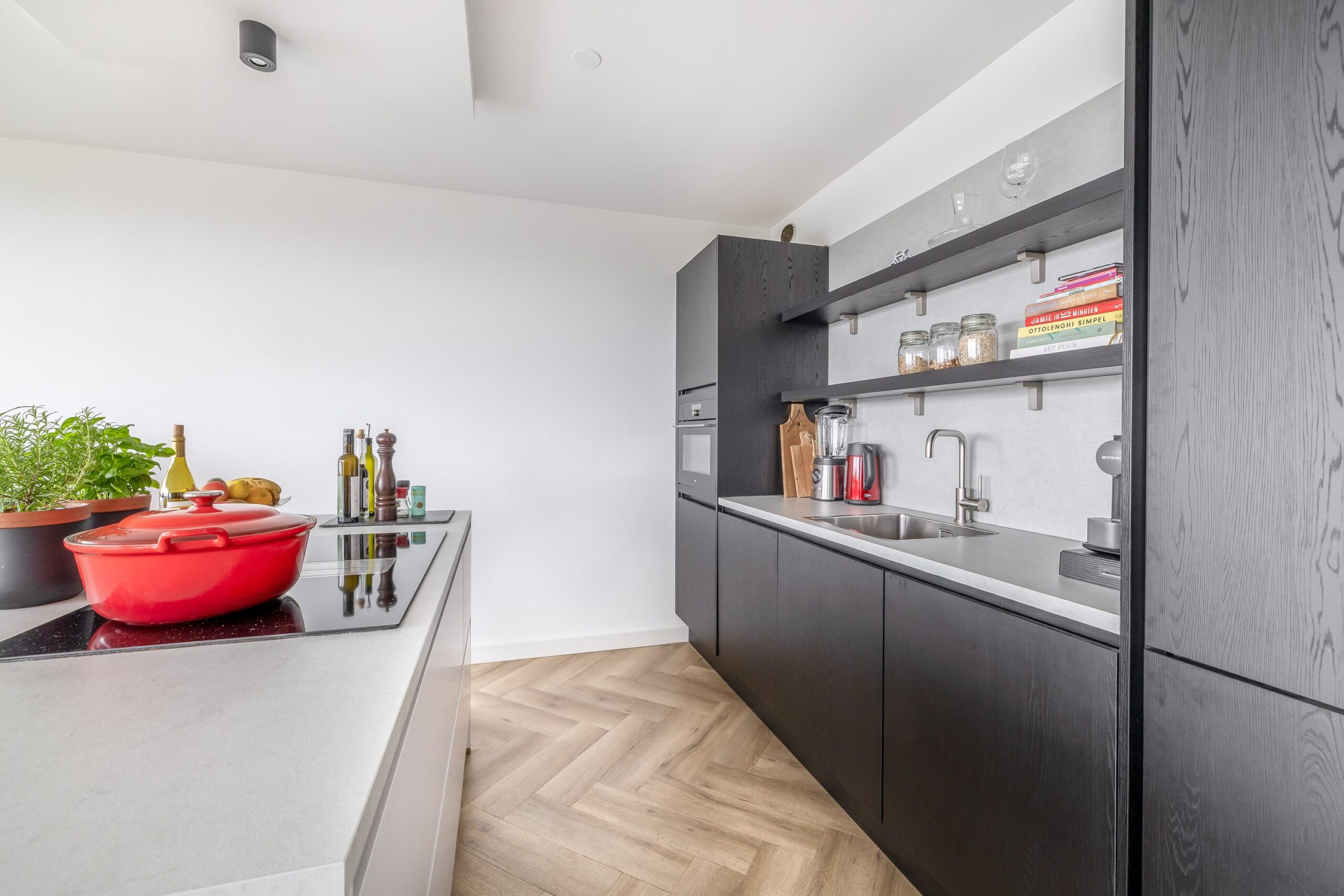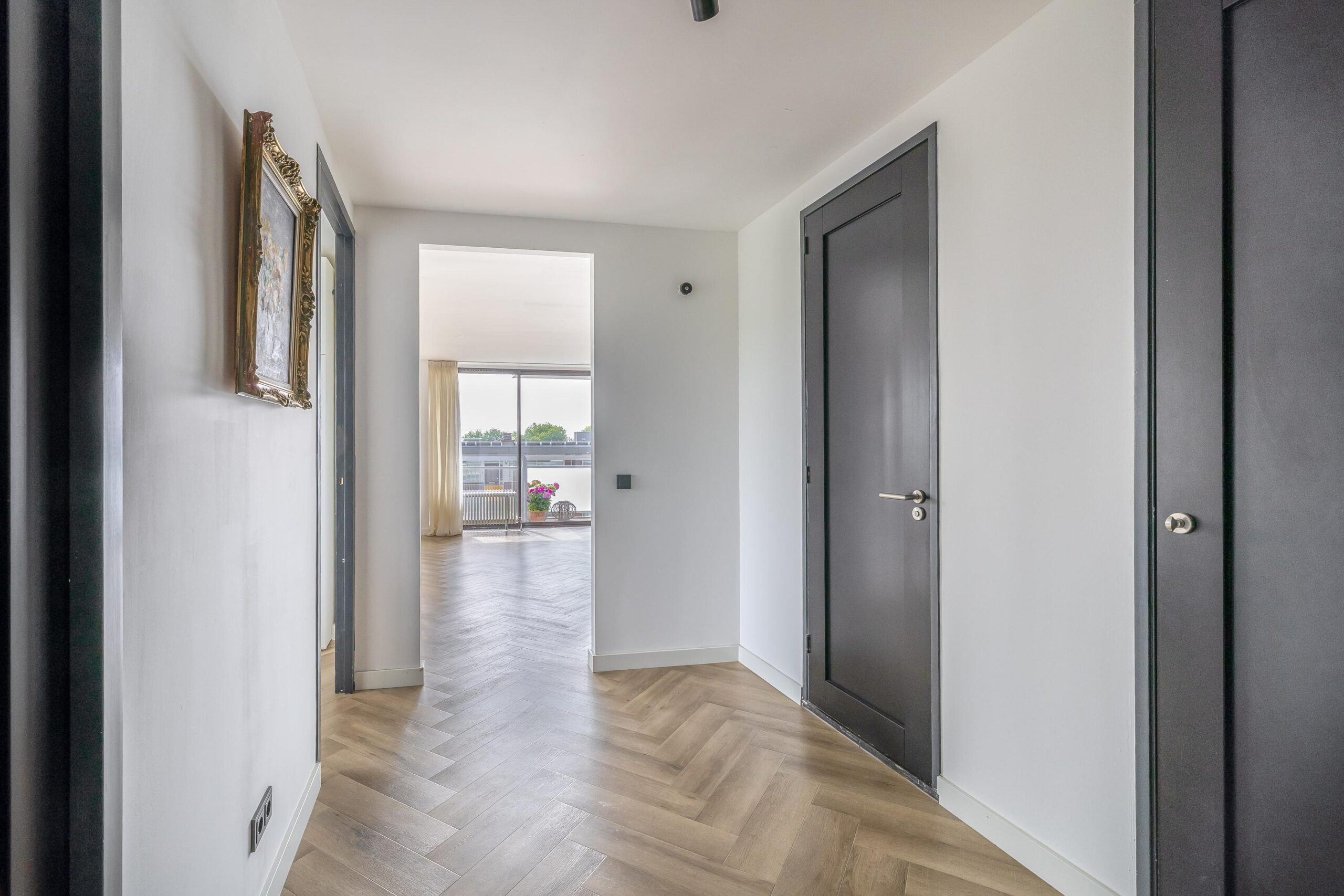 Het gehele appartement is afgewerkt met een hoogwaardige PVC-vloer in visgraatmotief, wat zorgt voor een warme en eigentijdse uitstraling.