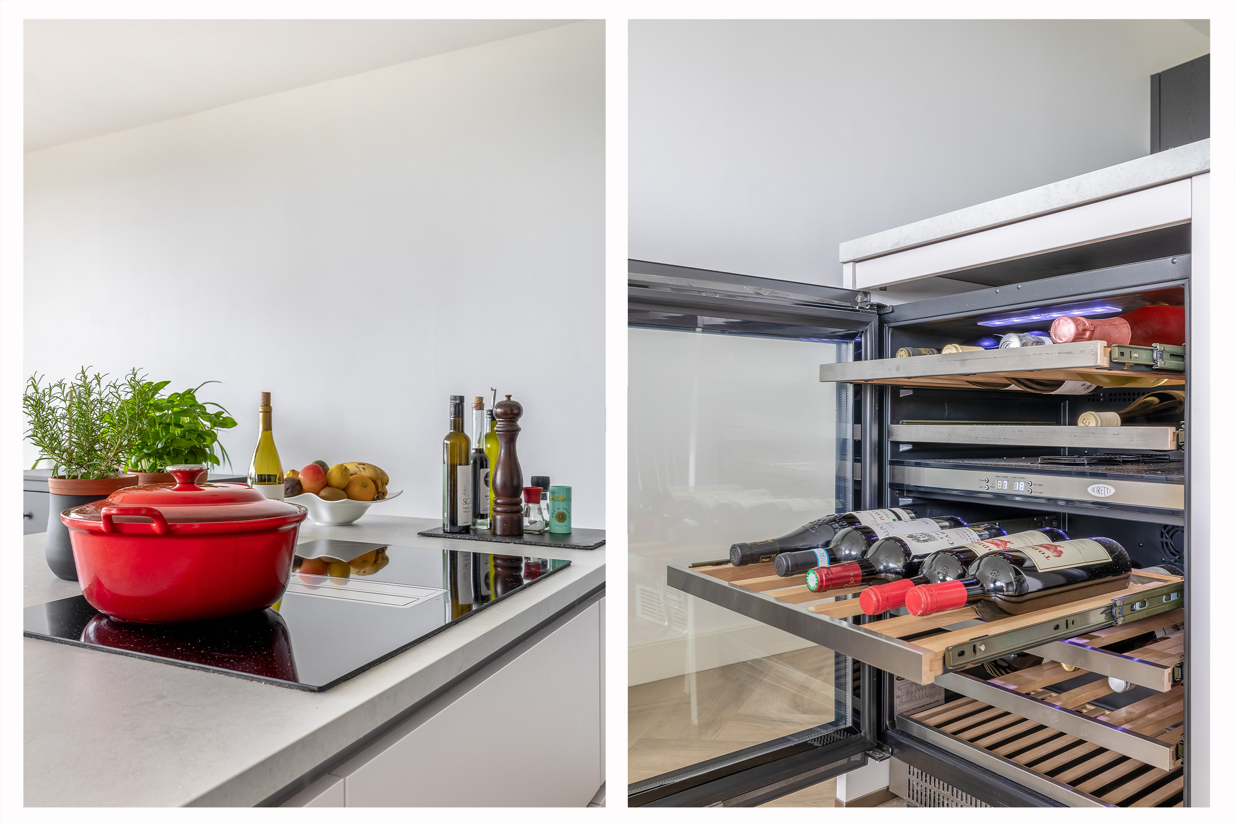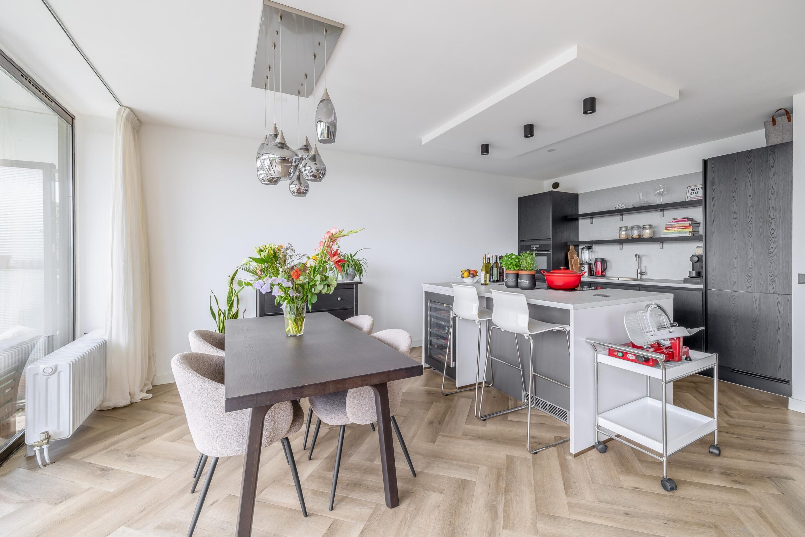 De absolute blikvanger is de royale woonkamer met eet- en zitgedeelte, waar het daglicht rijkelijk binnenvalt door twee grote schuifpuien. De open keuken vormt het hart van de leefruimte en is voorzien van een strak kookeiland en diverse inbouwapparatuur, waaronder een combi-oven/magnetron, koel-/vriescombinatie, vaatwasser en kookplaat met geïntegreerde afzuiging. De aanwezige wijnklimaatkast is eventueel ter overname en onderstreept het luxe karakter van de woning.