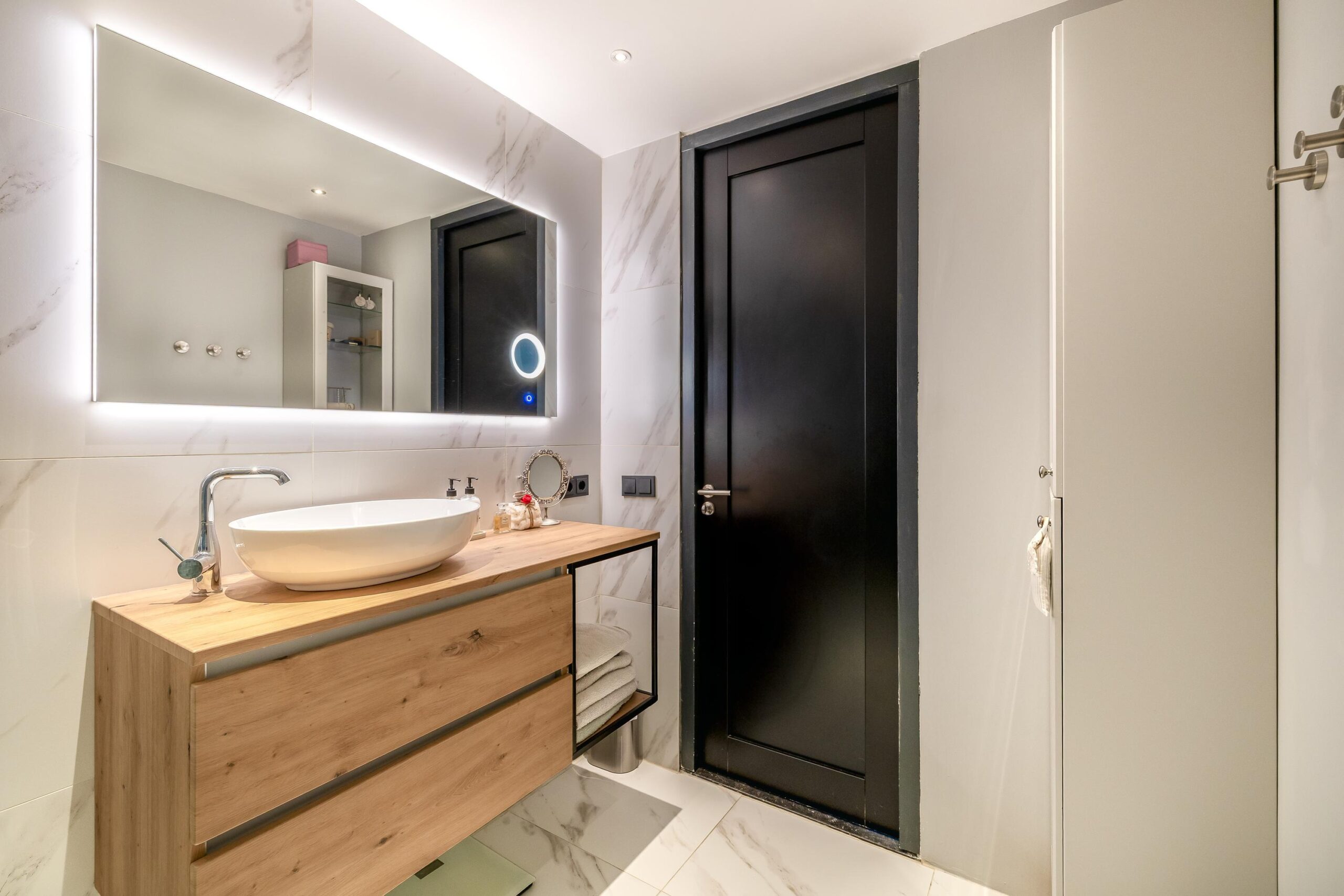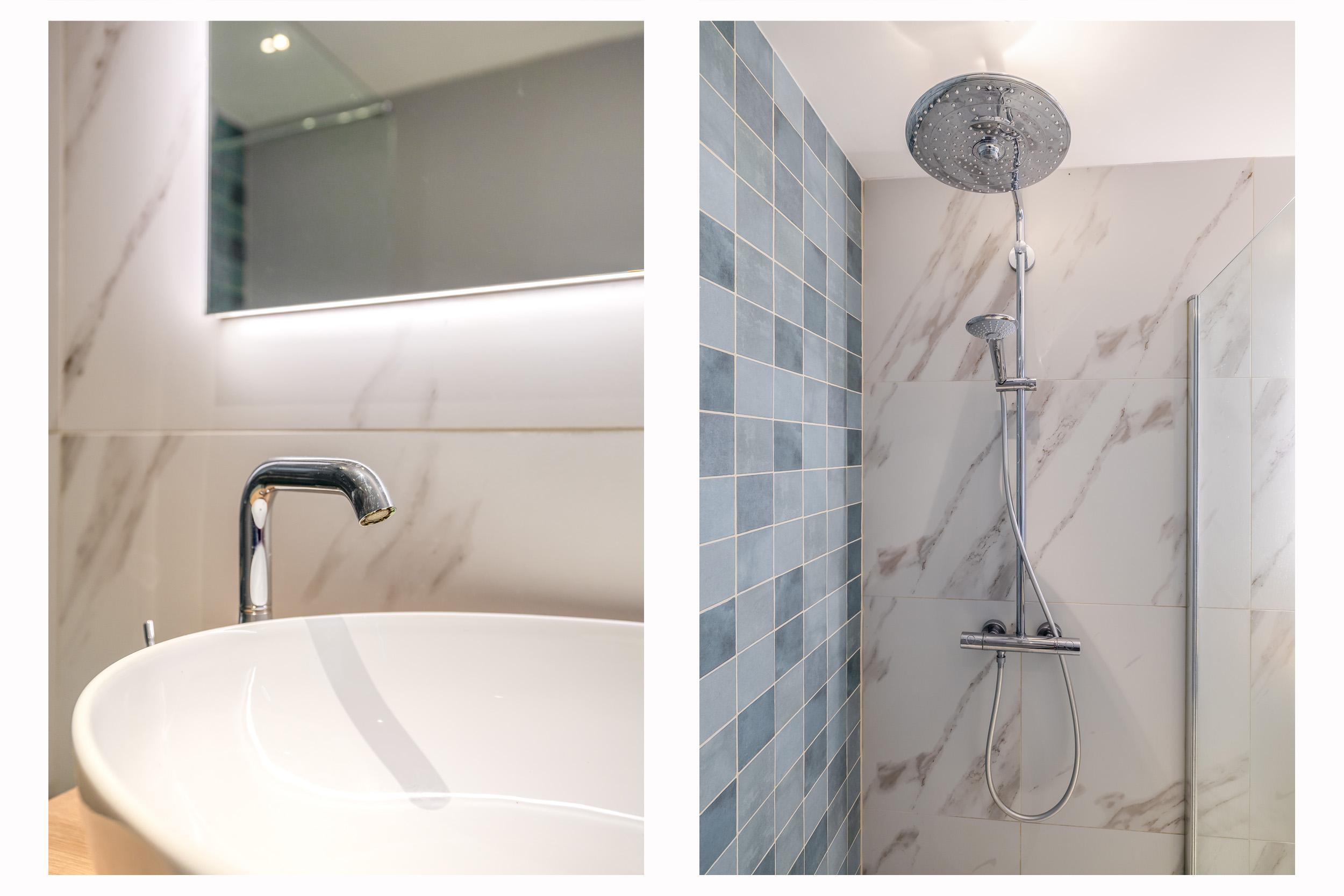 – Luxe badkamer met marmeren esthetiek en gestucte wanden;