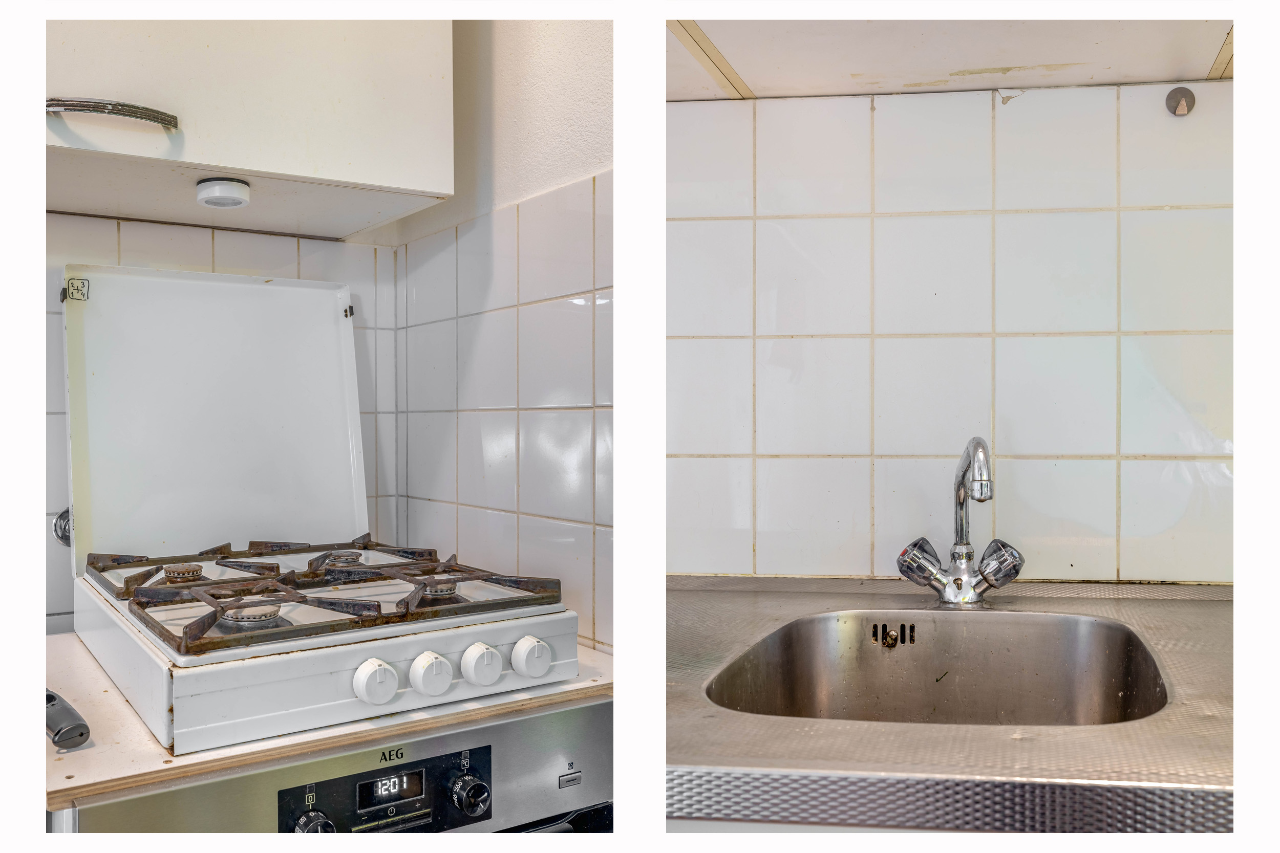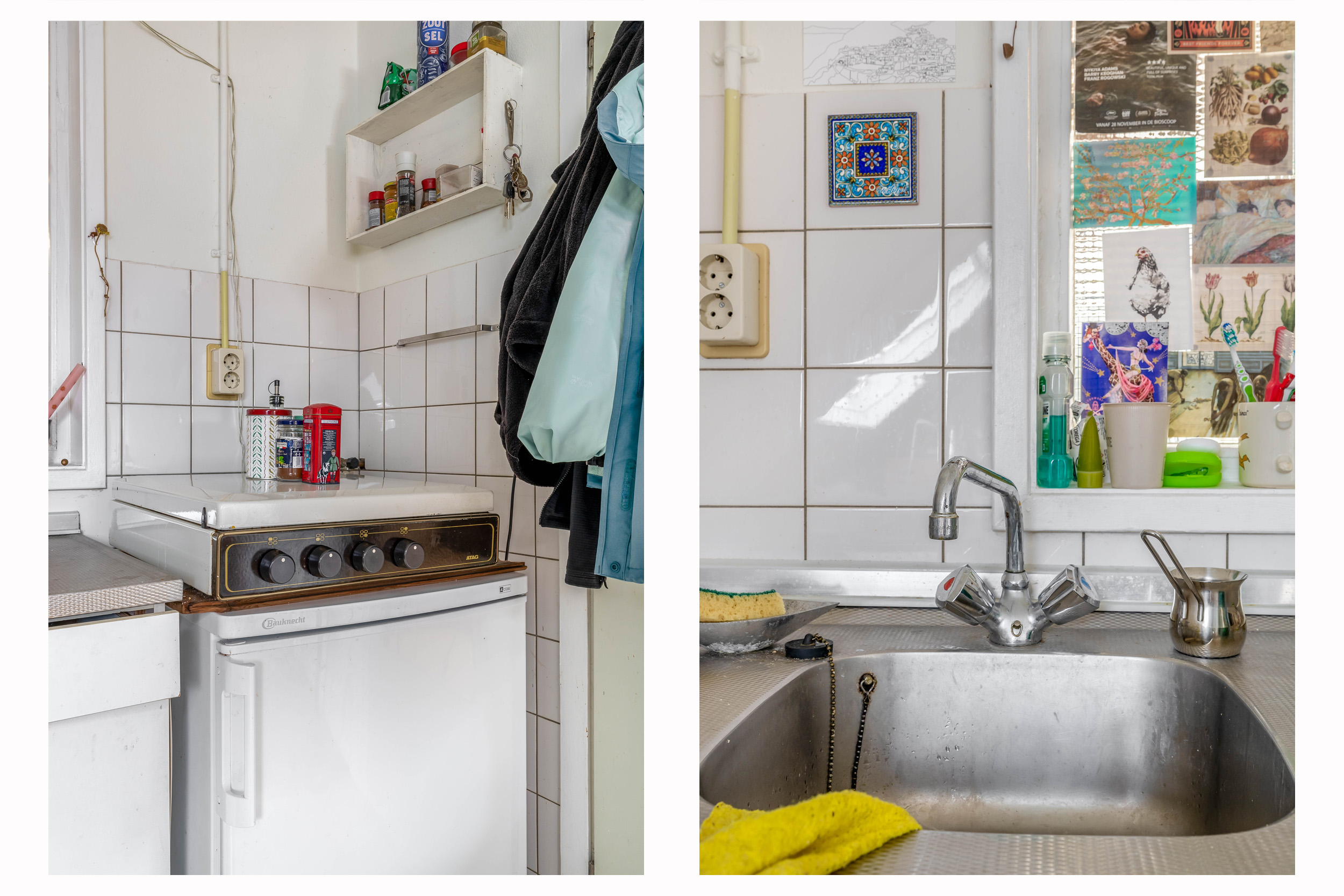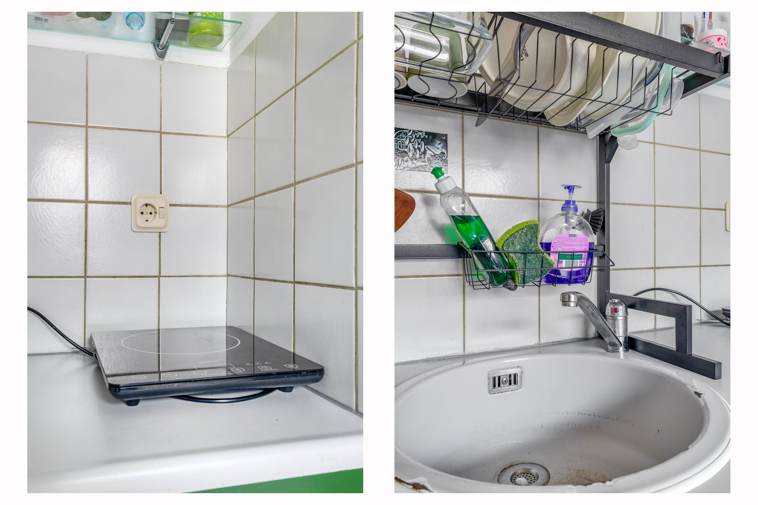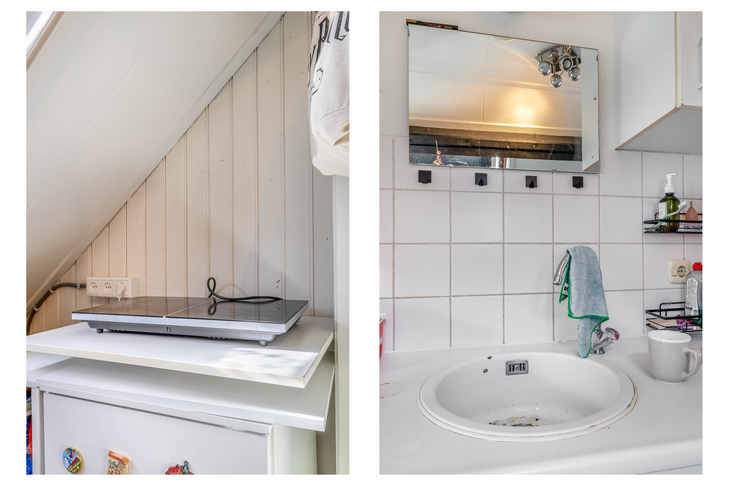 Verdieping voorzijde: 2 studentenkamers met keukens, kookplaten en koelkasten, 1 badkamer met douche, wastafel en toilet.