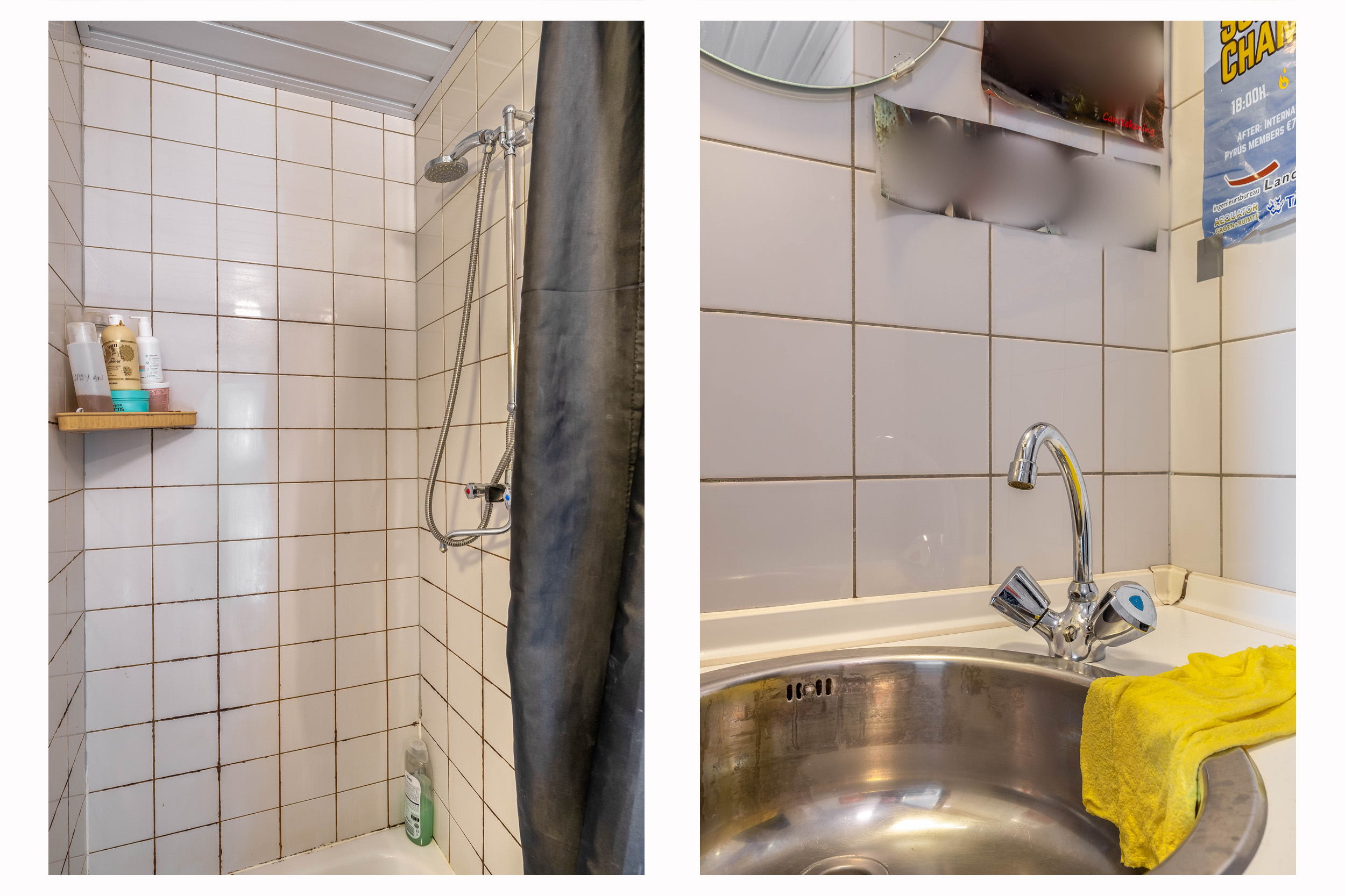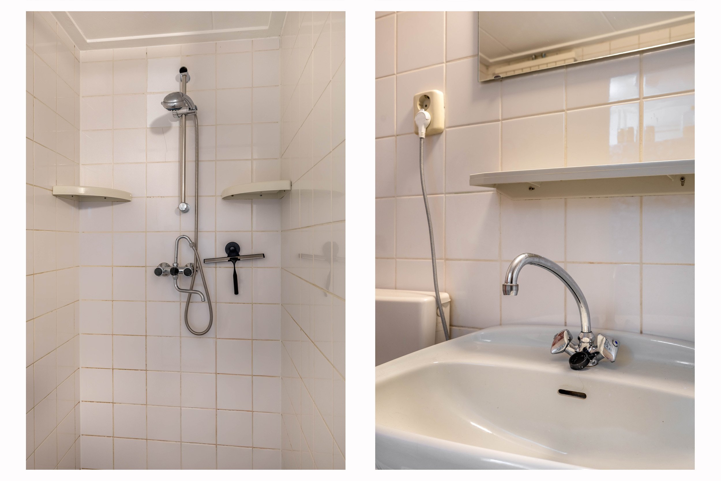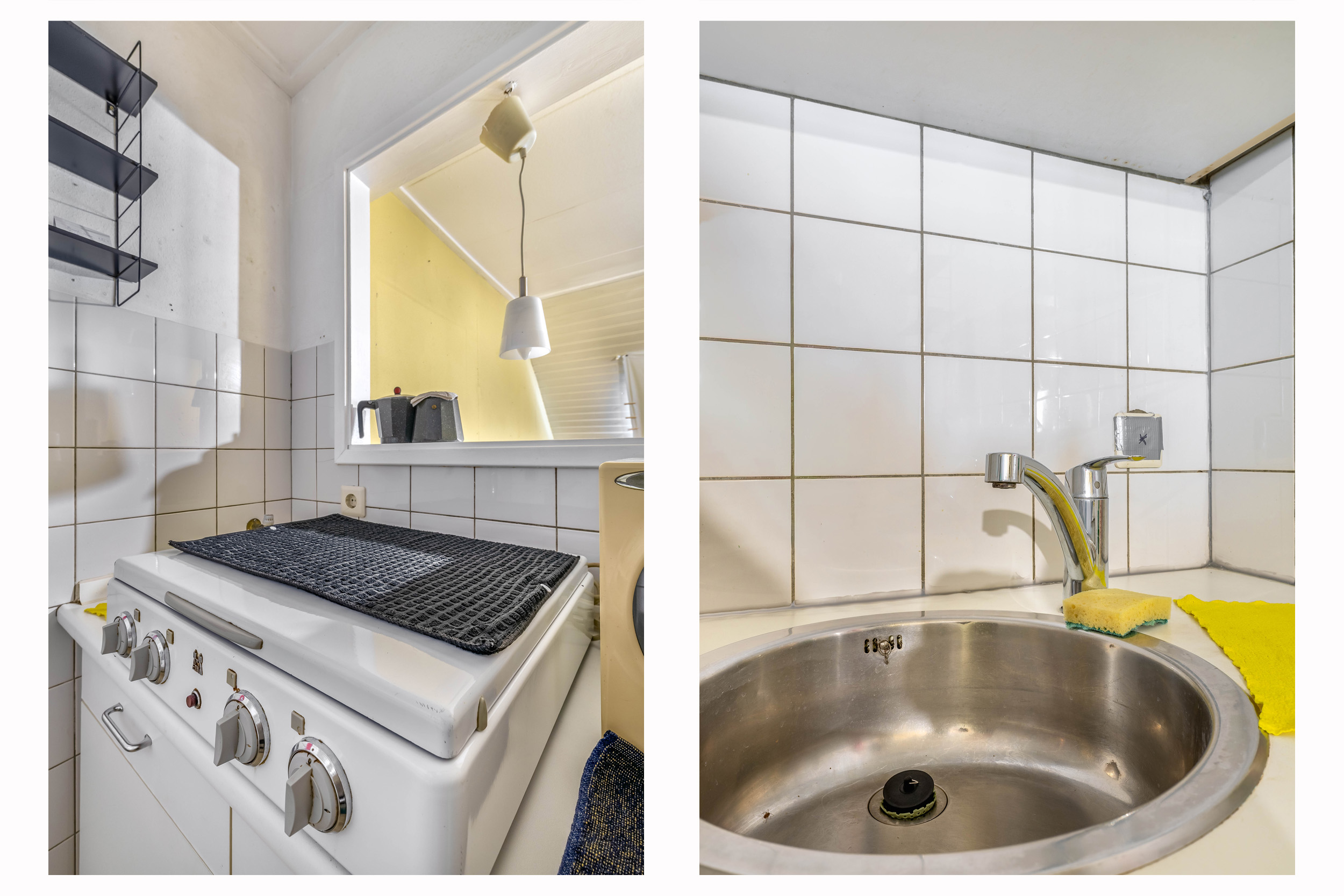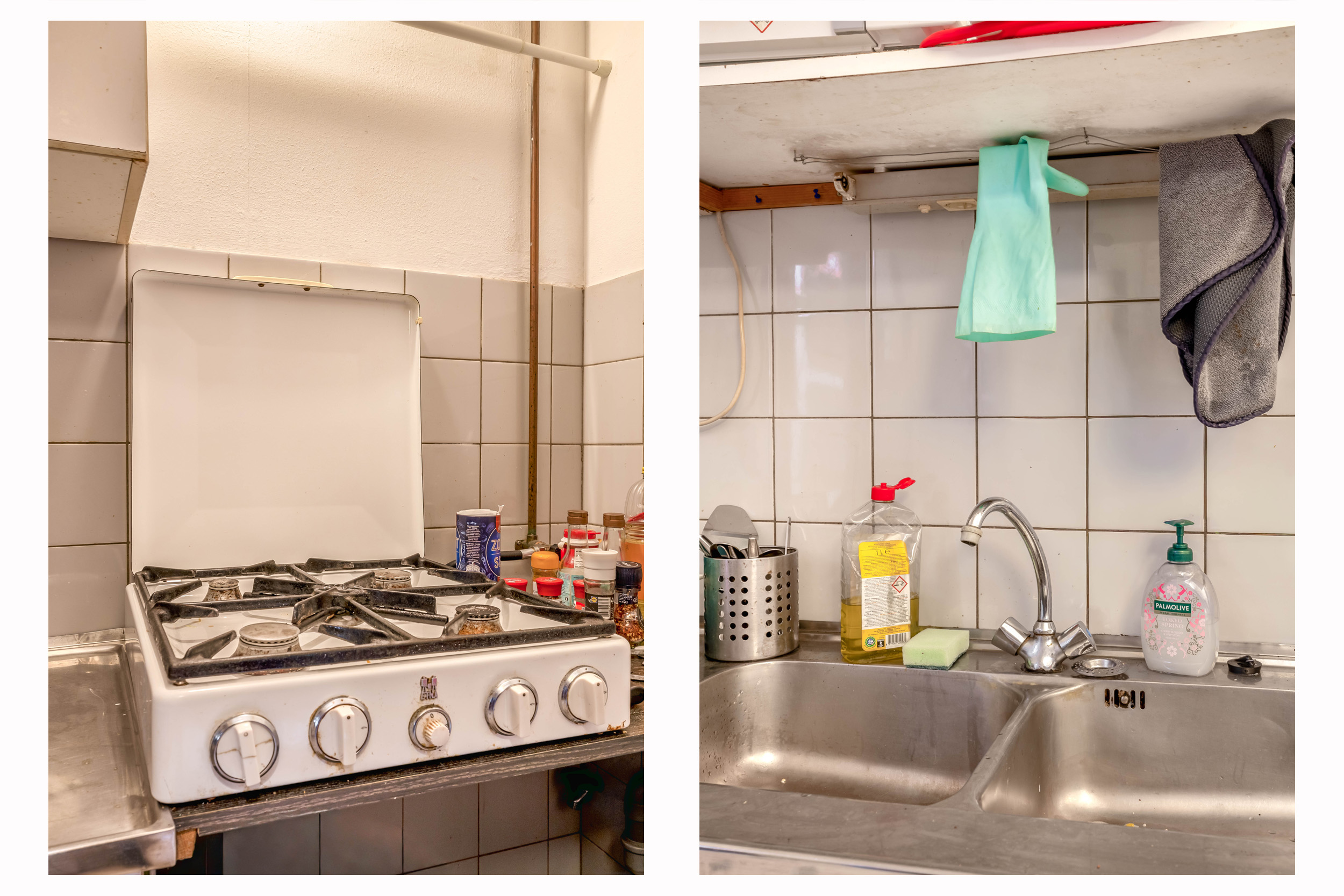 Verdieping voorzijde: 2 studentenkamers met keukens, kookplaten en koelkasten, 1 badkamer met douche, wastafel en toilet.