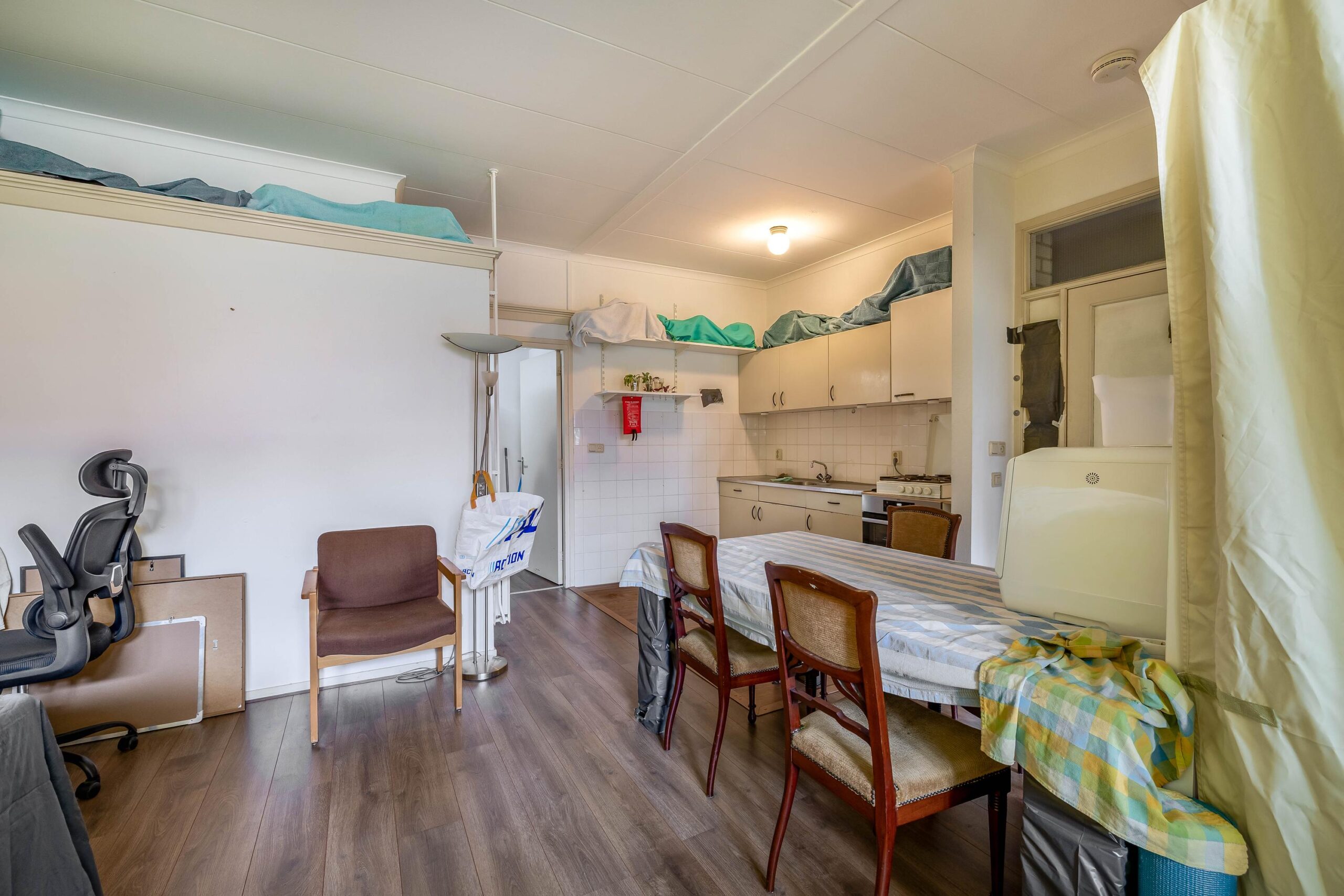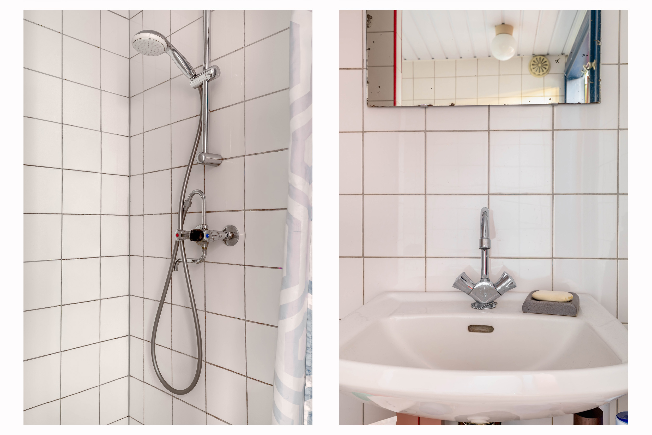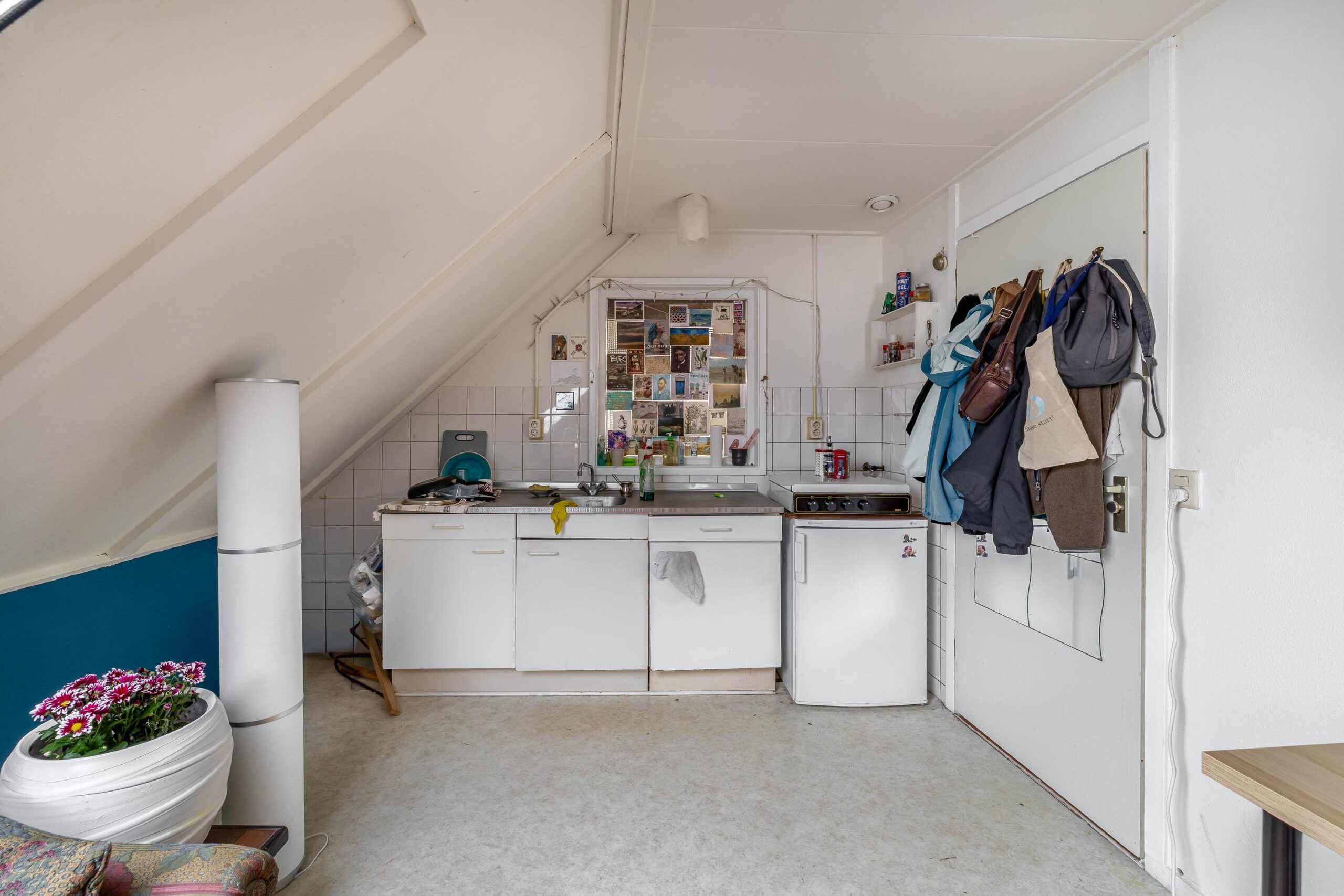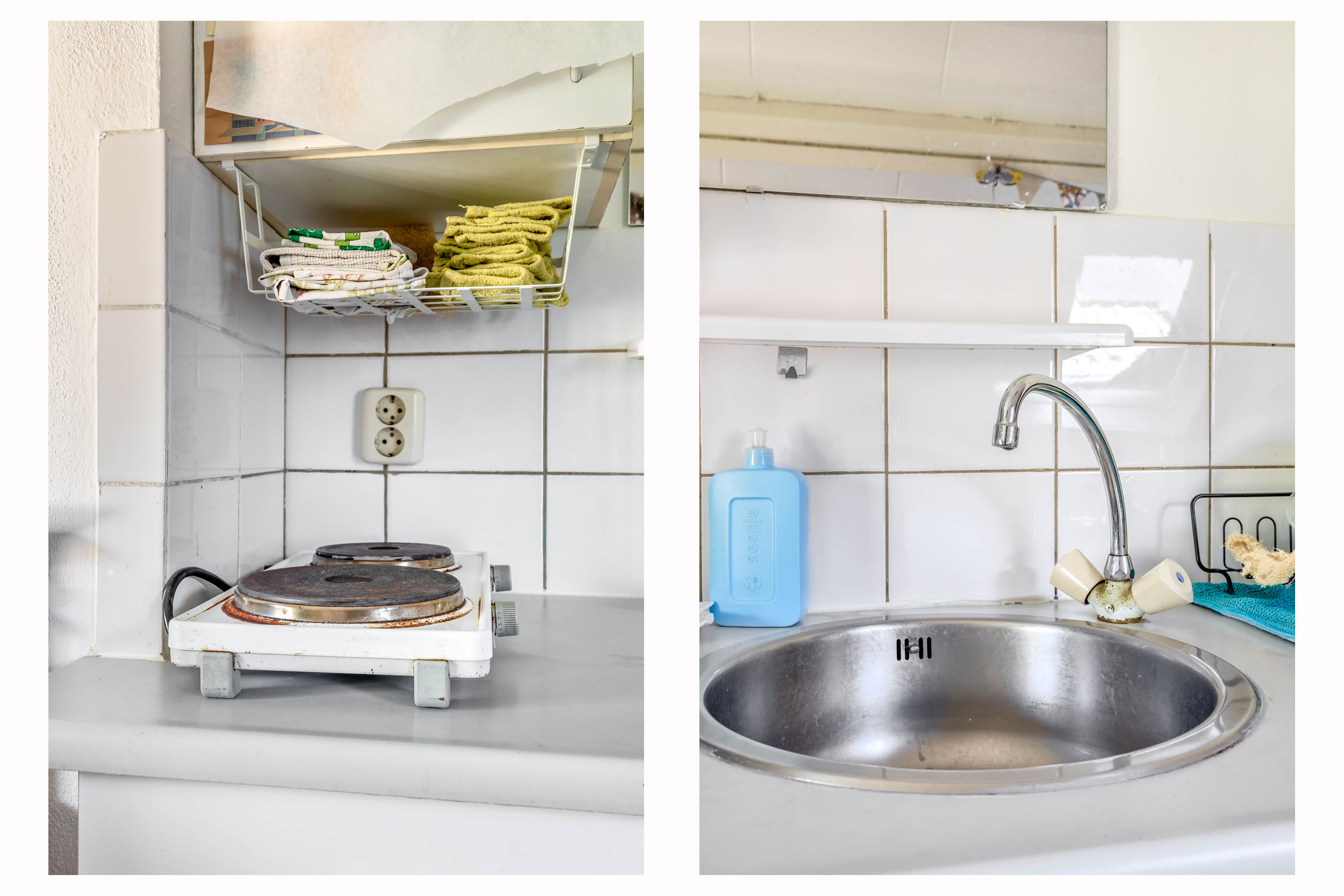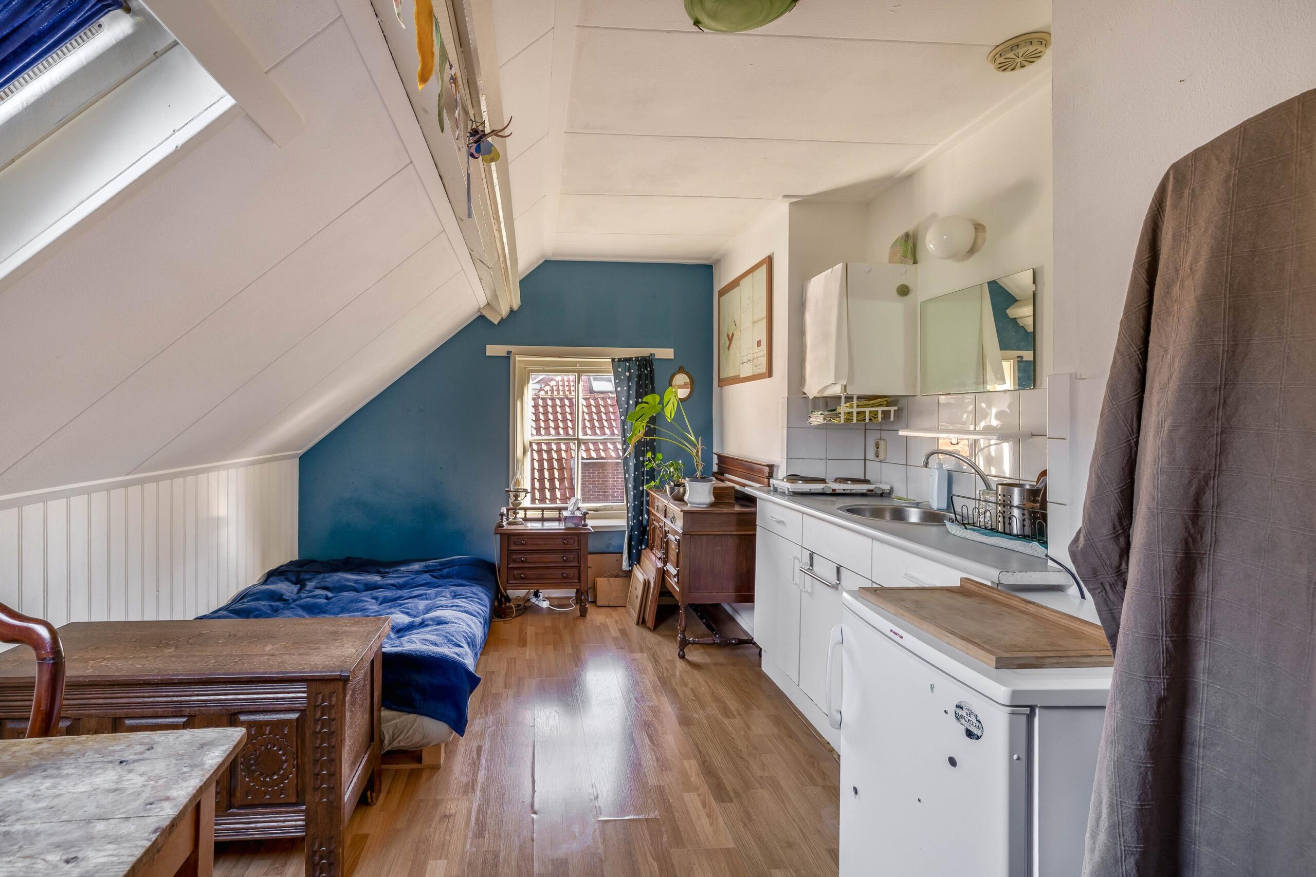 Verdieping voorzijde: 2 studentenkamers met keukens, kookplaten en koelkasten, 1 badkamer met douche, wastafel en toilet.