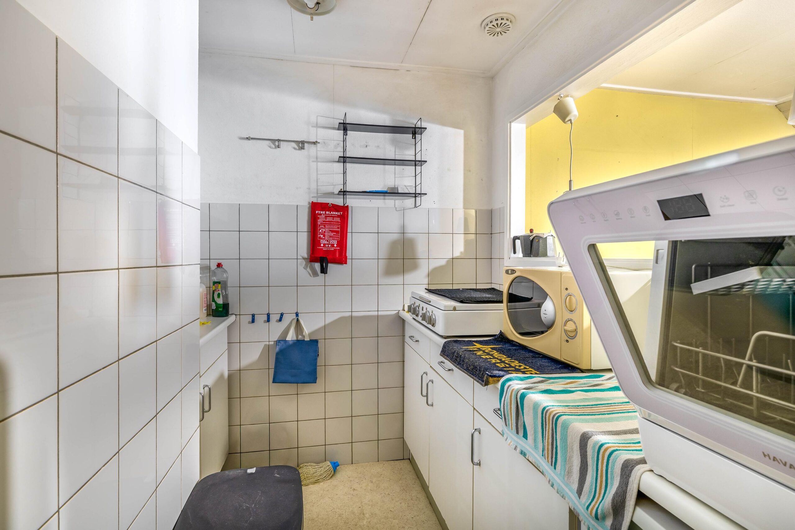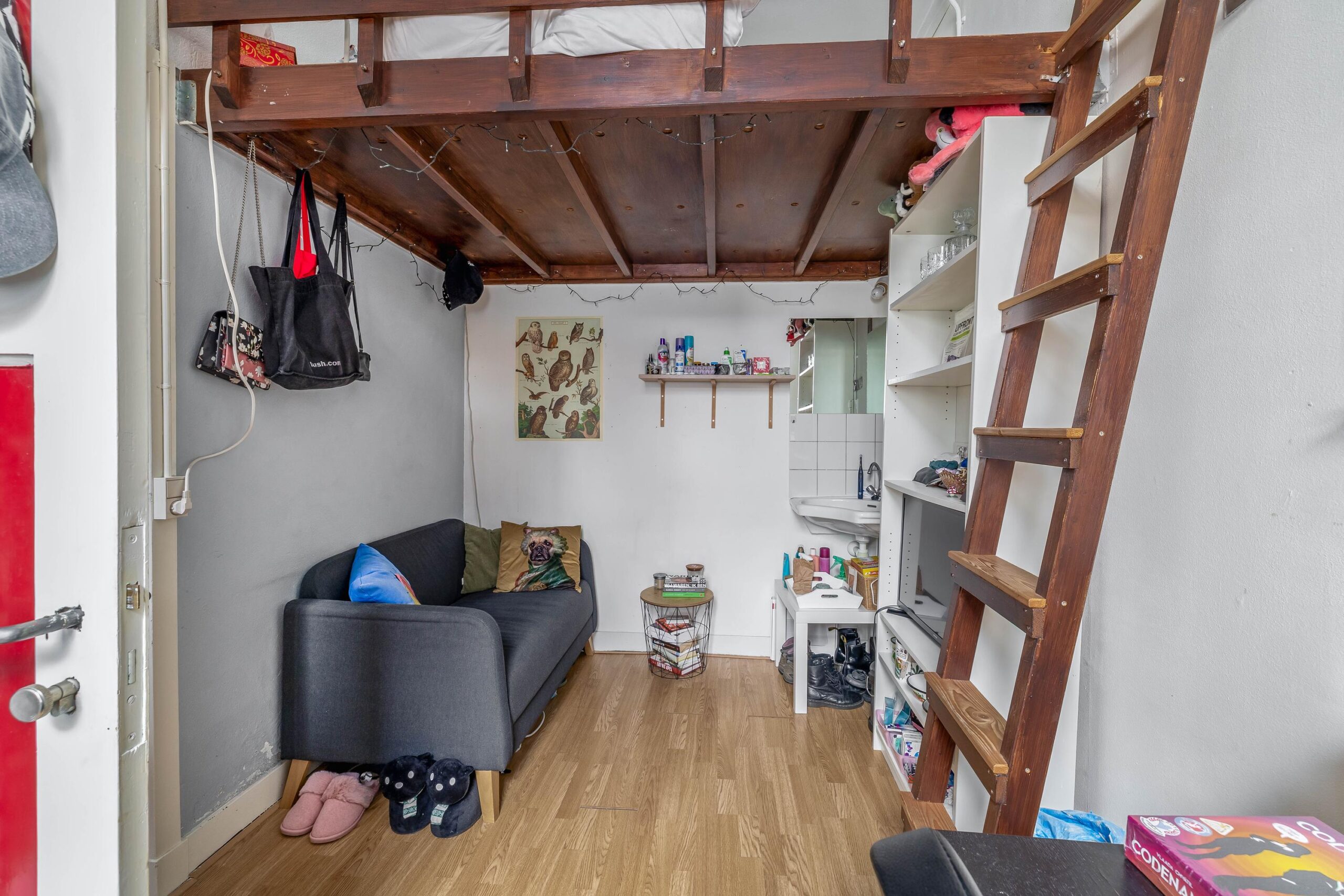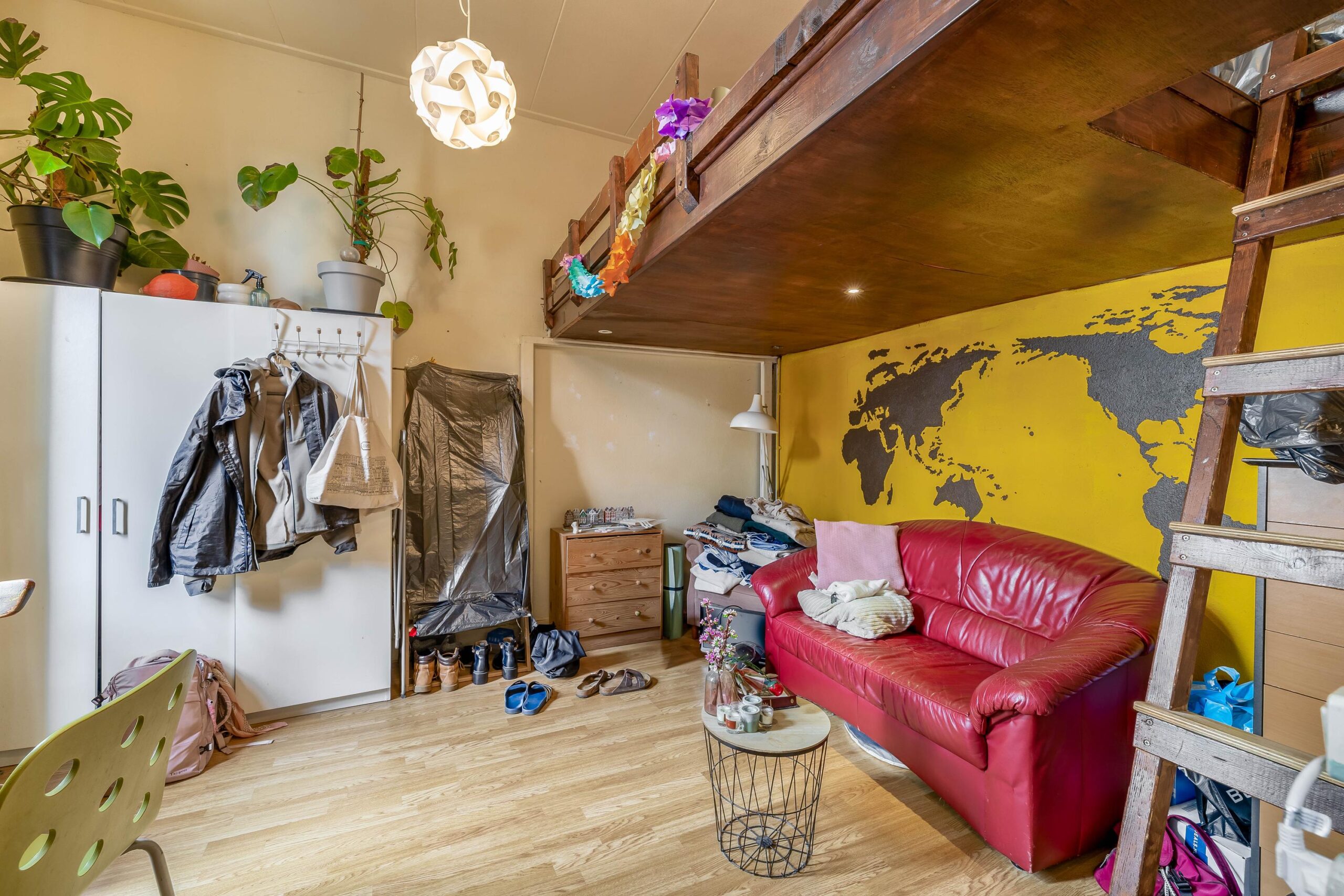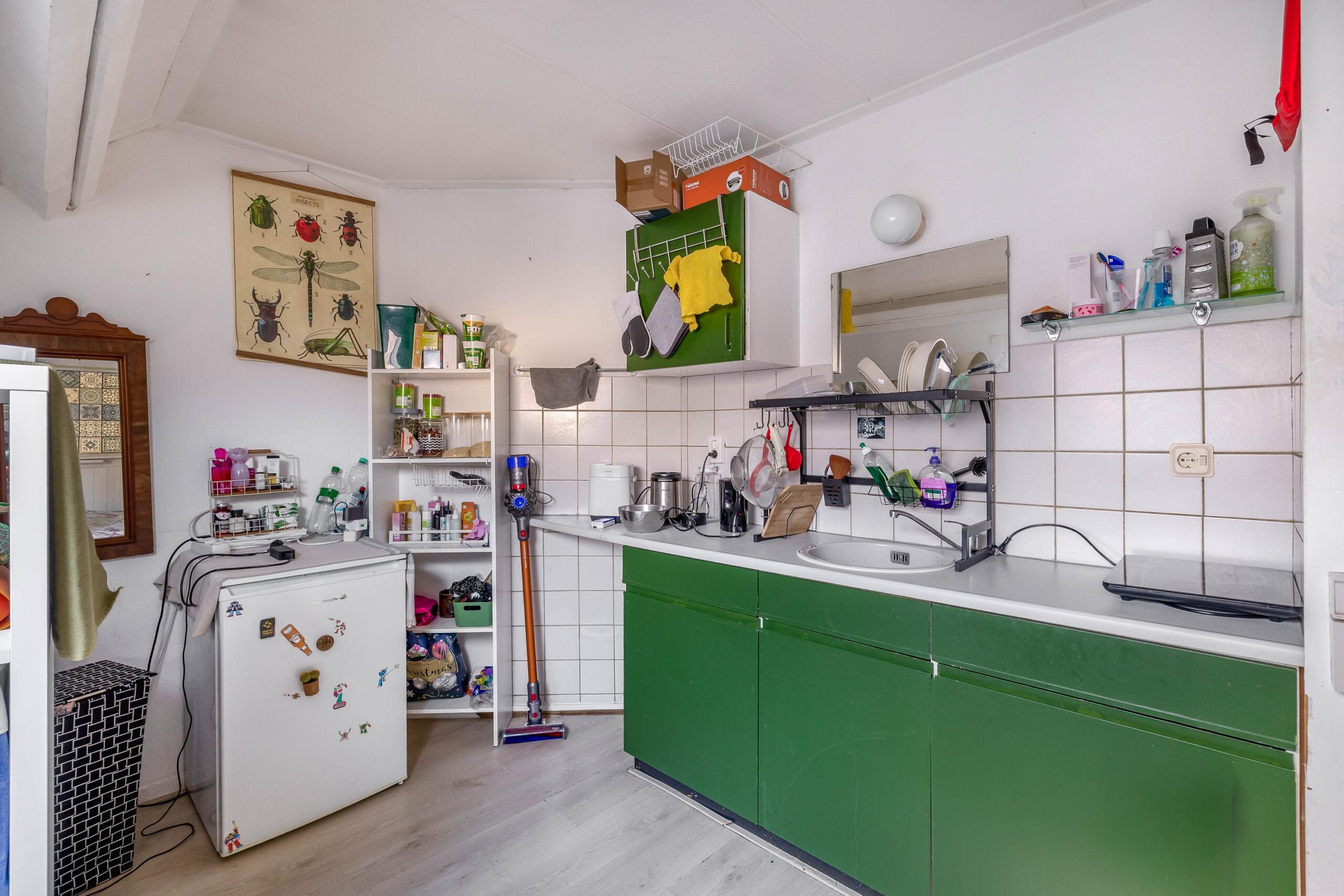 Verdieping voorzijde: 2 studentenkamers met keukens, kookplaten en koelkasten, 1 badkamer met douche, wastafel en toilet.