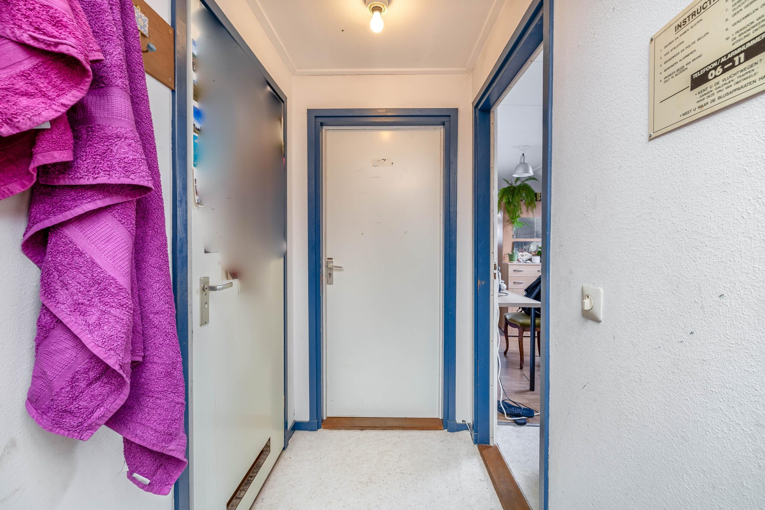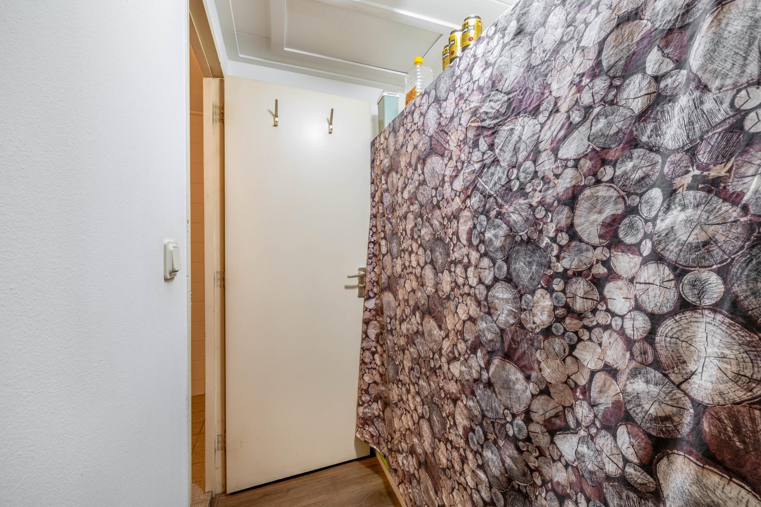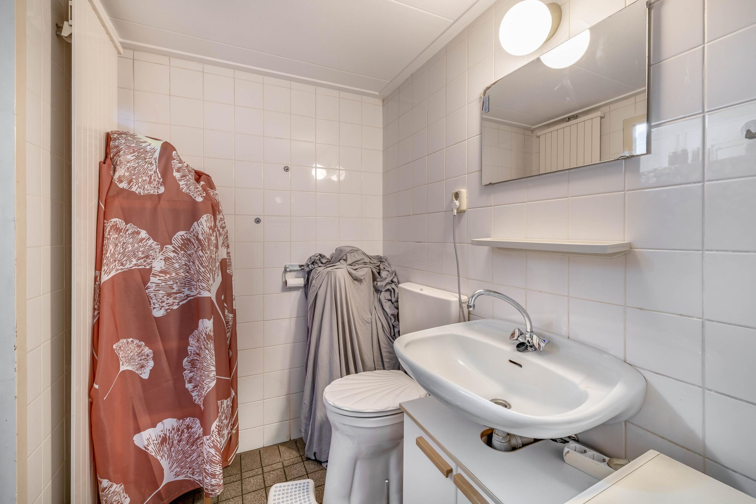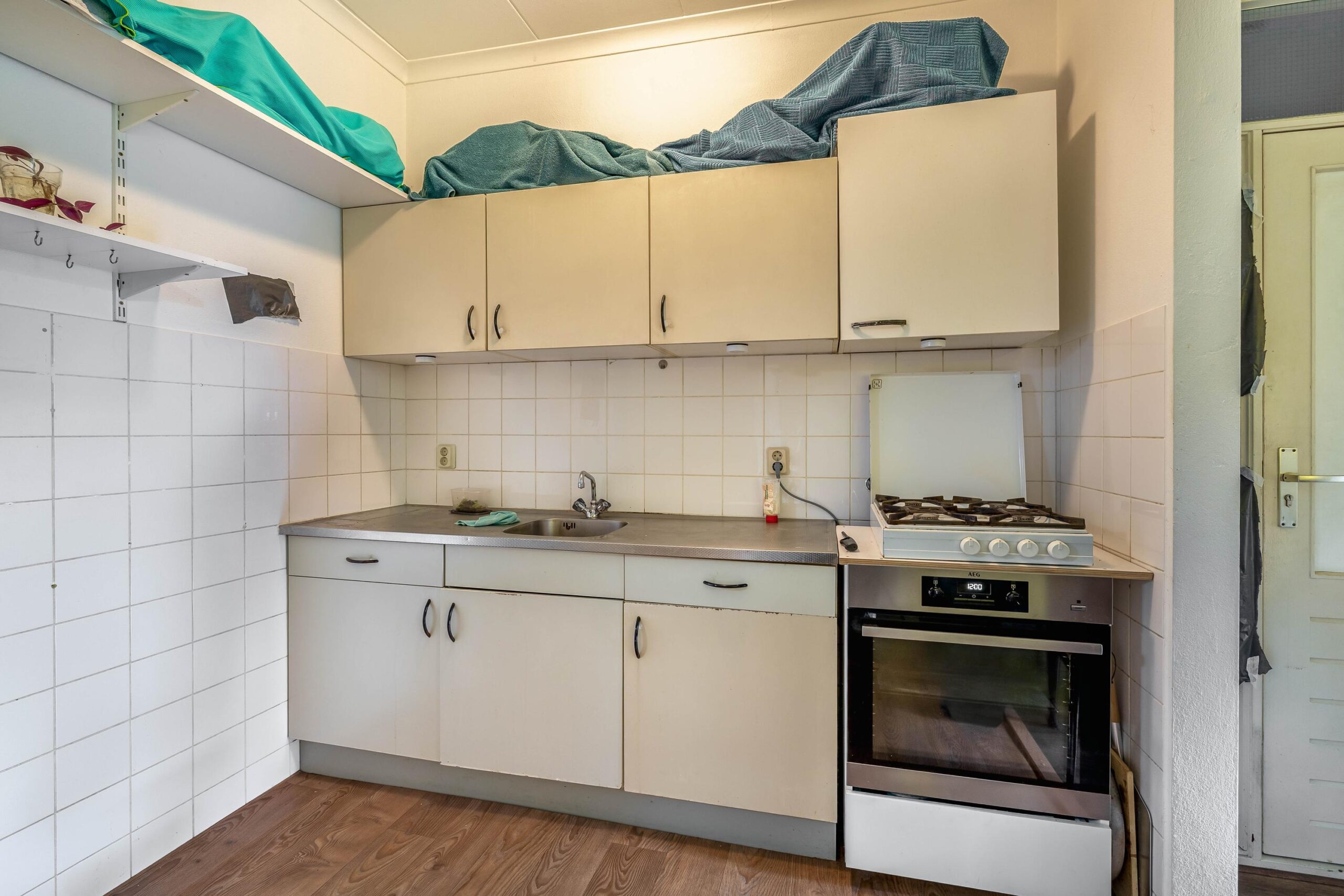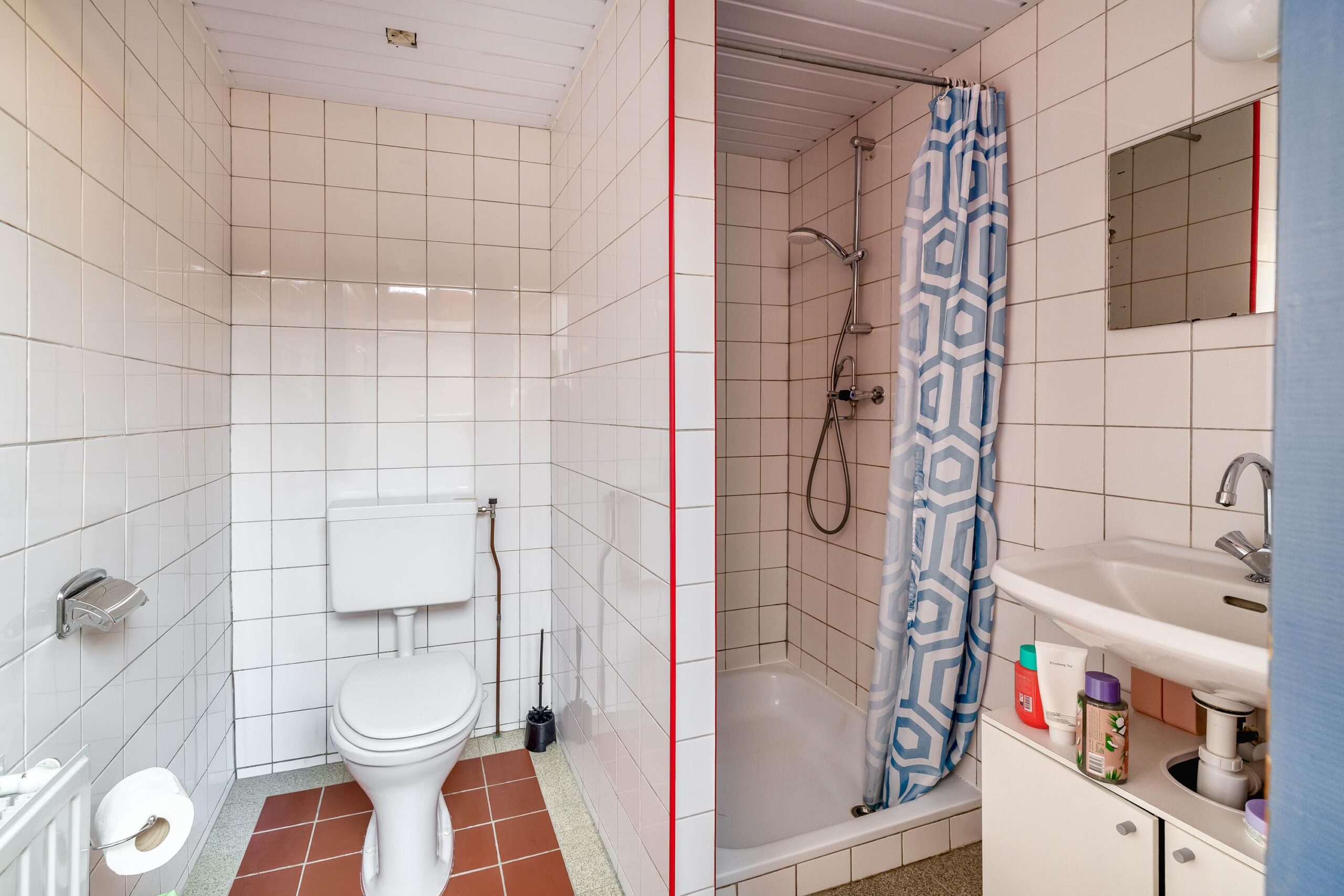 Appartement begane grond achter met tuin, woonkamer, slaapkamer, keuken, badkamer met douche, wastafel en toilet.