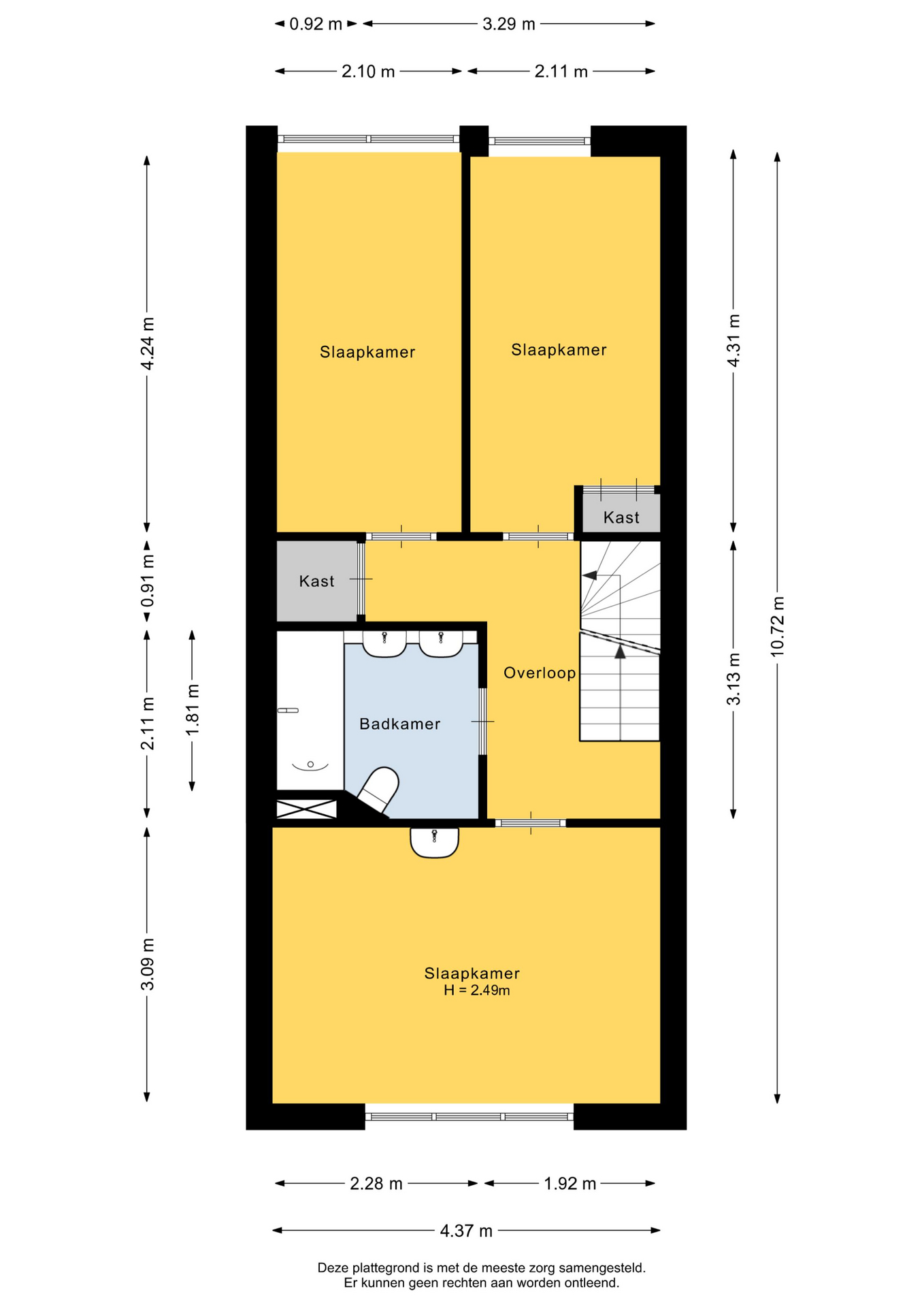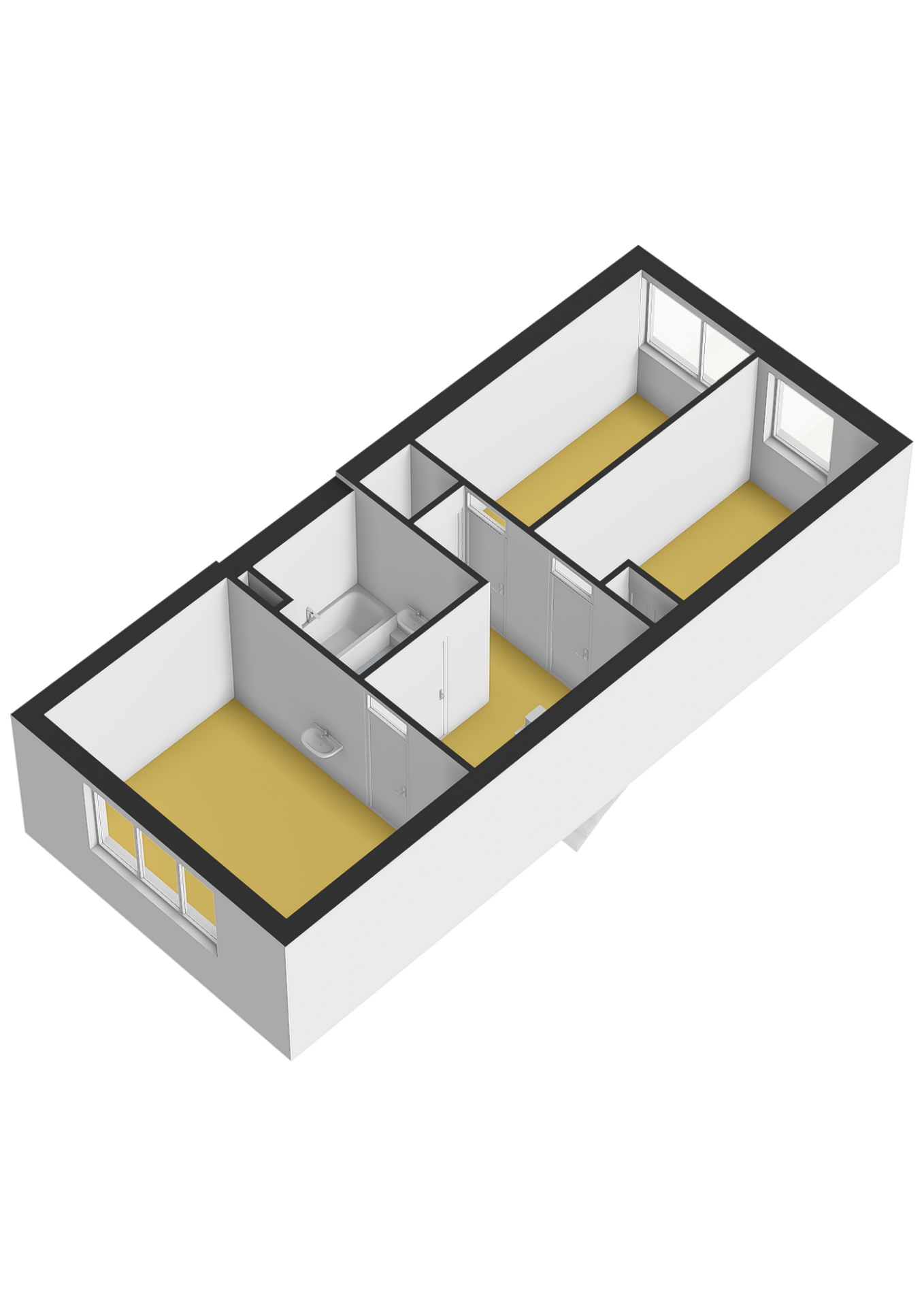 1e verdieping: Overloop met inbouwkast; slaapkamer I met frans balkon aan de voorzijde gelegen over de volle breedte van het woonhuis met wastafel; badkamer v.v. toilet, dubbele wastafel, ligbad; aan de achterzijde van het woonhuis bevinden zich slaapkamer II en slaapkamer III.
