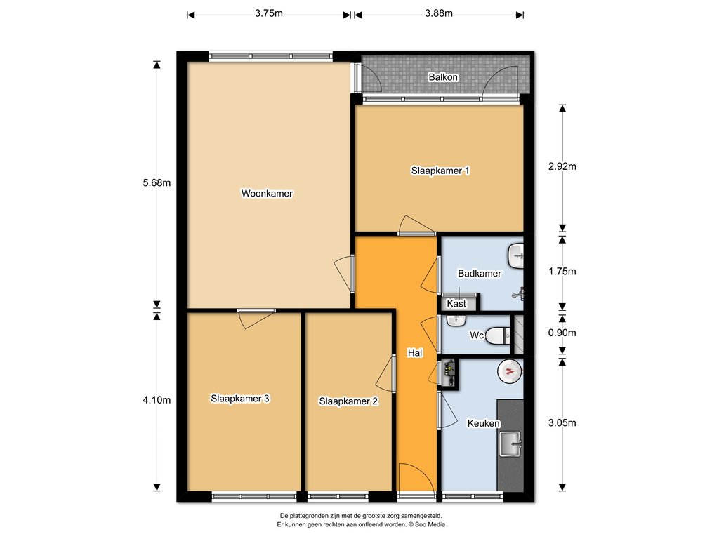 Entree; hal; meterkast; toilet met fonteintje; lichte woonkamer met toegang tot het balkon; slaapkamer I met toegang tot het balkon; slaapkamer II; slaapkamer III; badkamer voorzien van douche en wastafel; keuken voorzien van eenvoudig keukenblok en boiler (Inventum 80ltr).