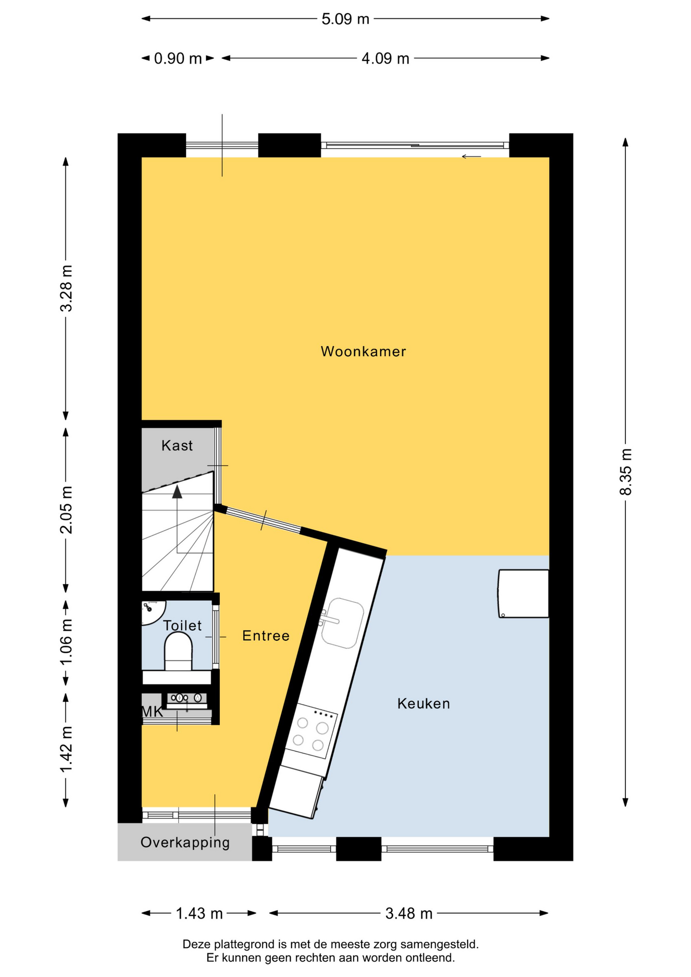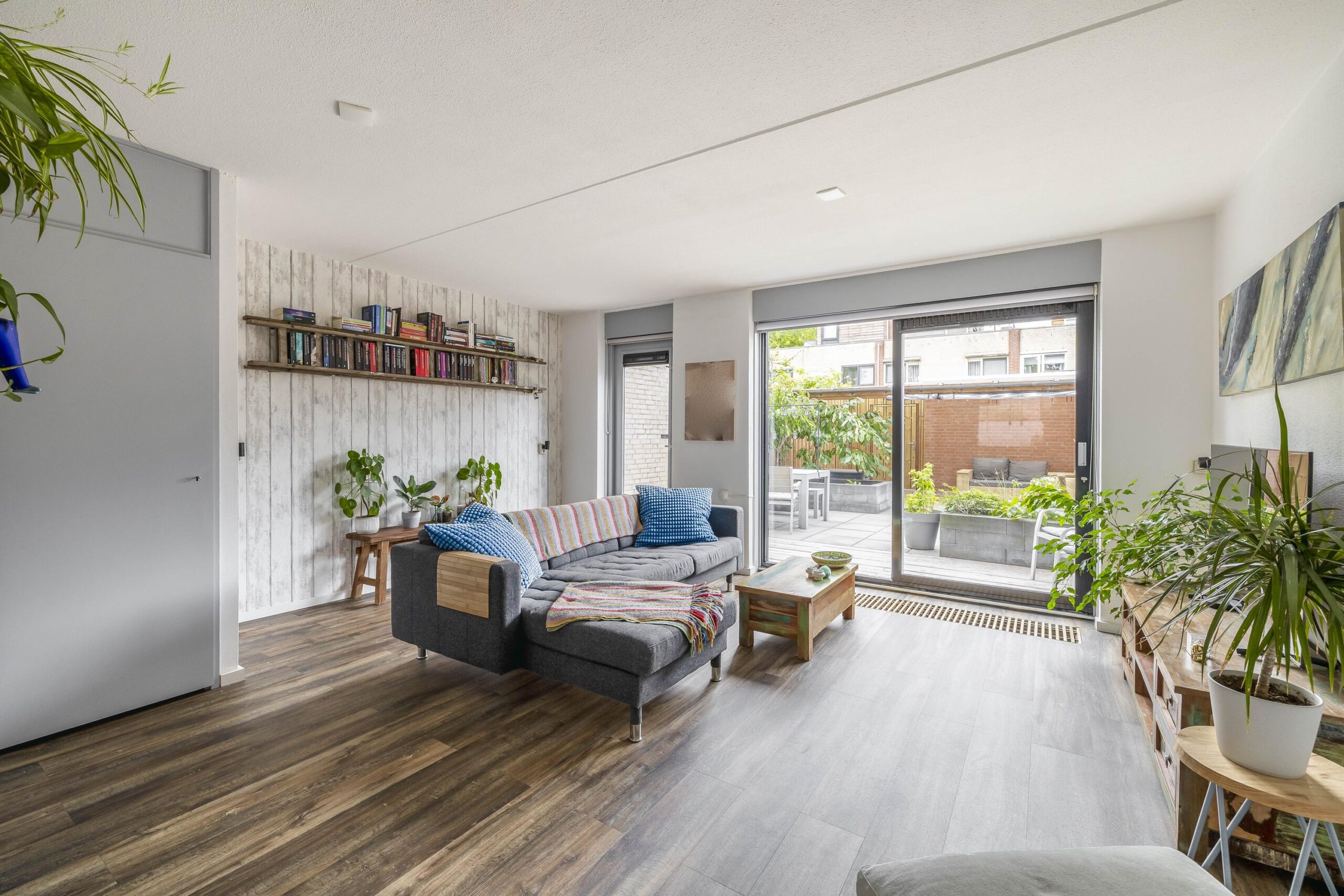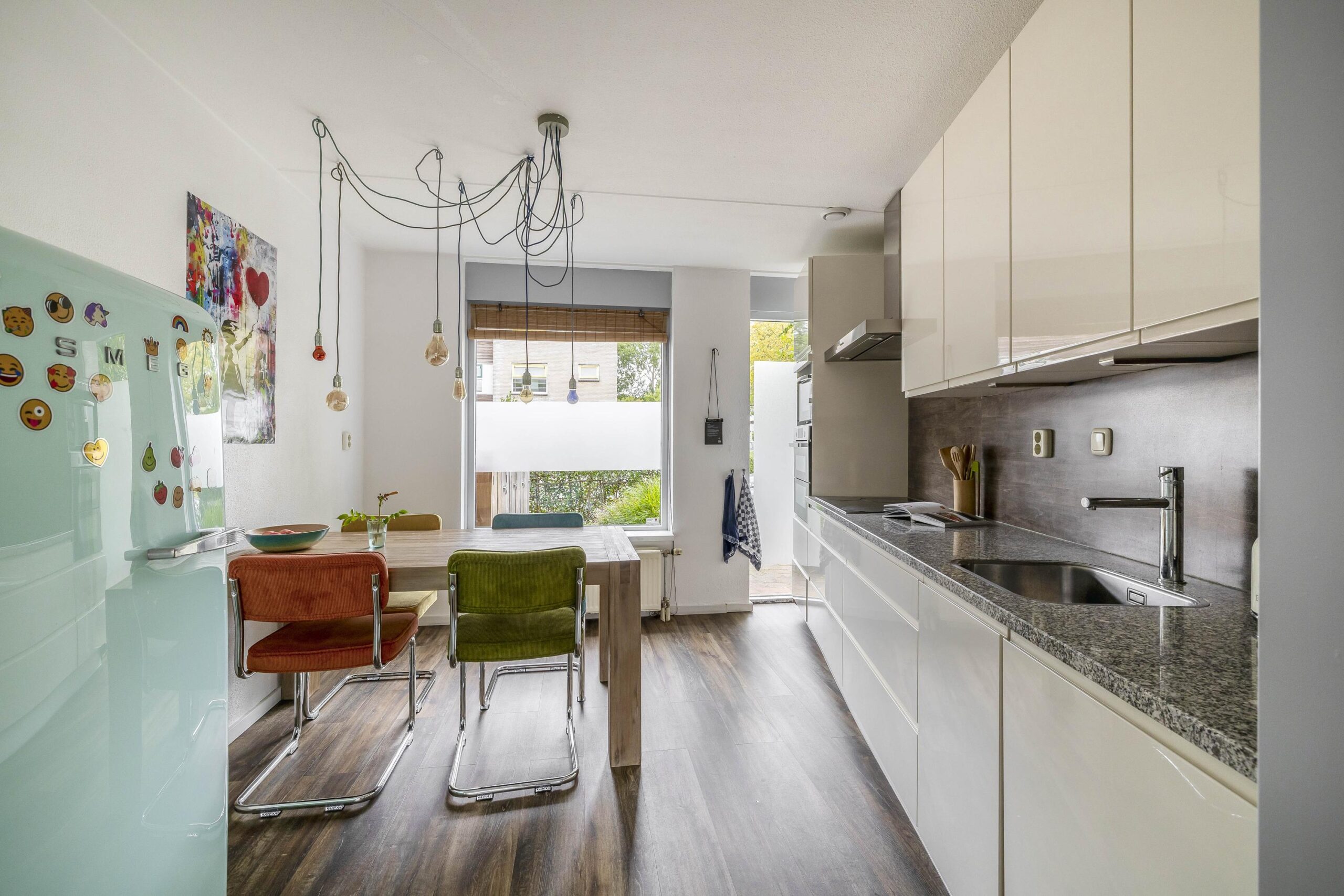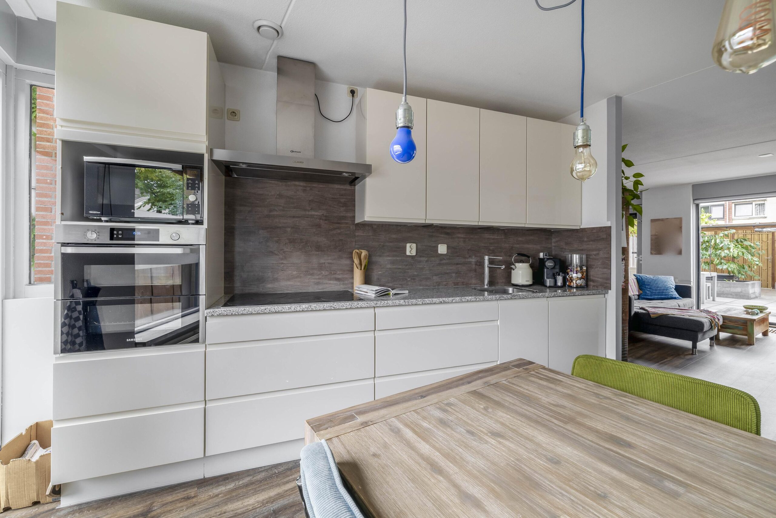 Begane grond: entree, hal met een garderobenis, meterkast en een moderne toiletruimte tot het plafond betegeld met wandcloset en fontein, trapkast, een tuingerichte lichte woonkamer voorzien van laminaatvloer met een schuifpui en tevens loopdeur naar de achtertuin, open keuken uitgevoerd in een lichte kleurstelling aan de voorzijde uitgevoerd in een rechte keukenopstelling met diverse inbouwapparatuur, te weten: inductiekookplaat met afzuigschouw, dubbele oven en een vaatwasmachine.