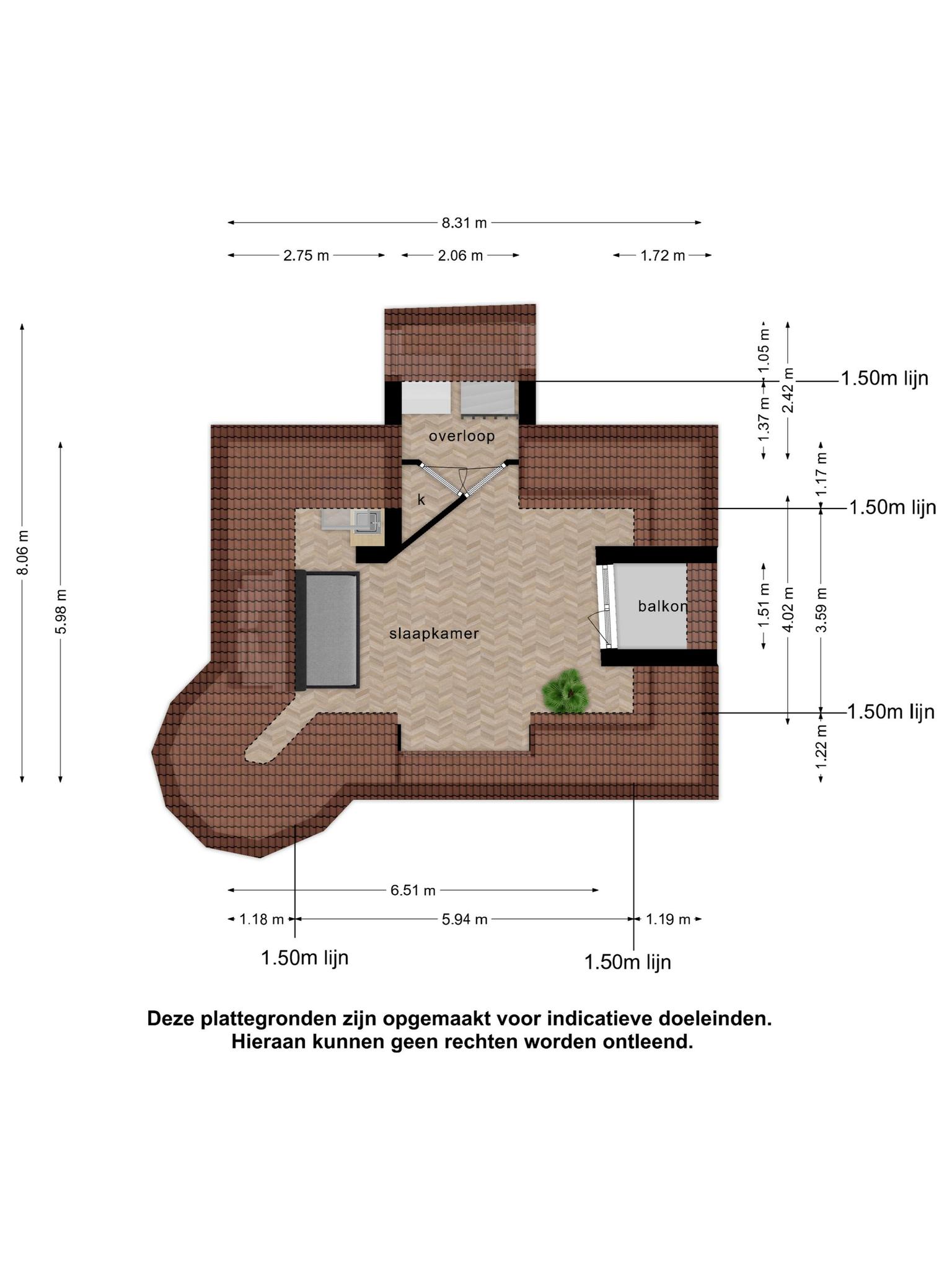 2e verdieping: overloop met opbergkast; grote ruimte met keukenblokje en toegang tot het balkon met uitzicht op de molen.