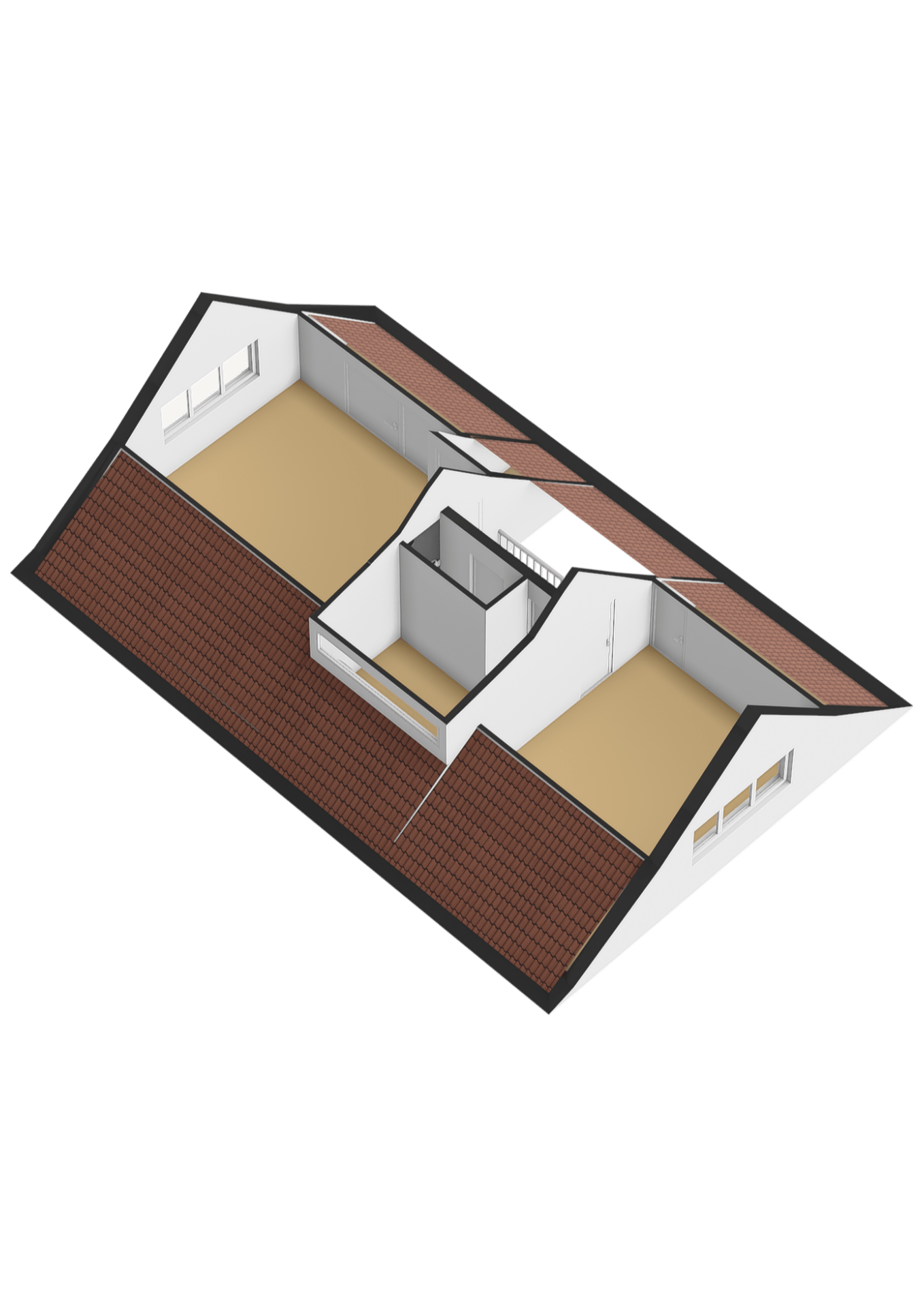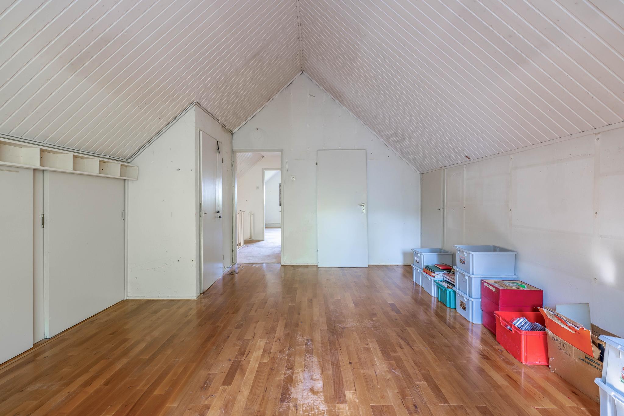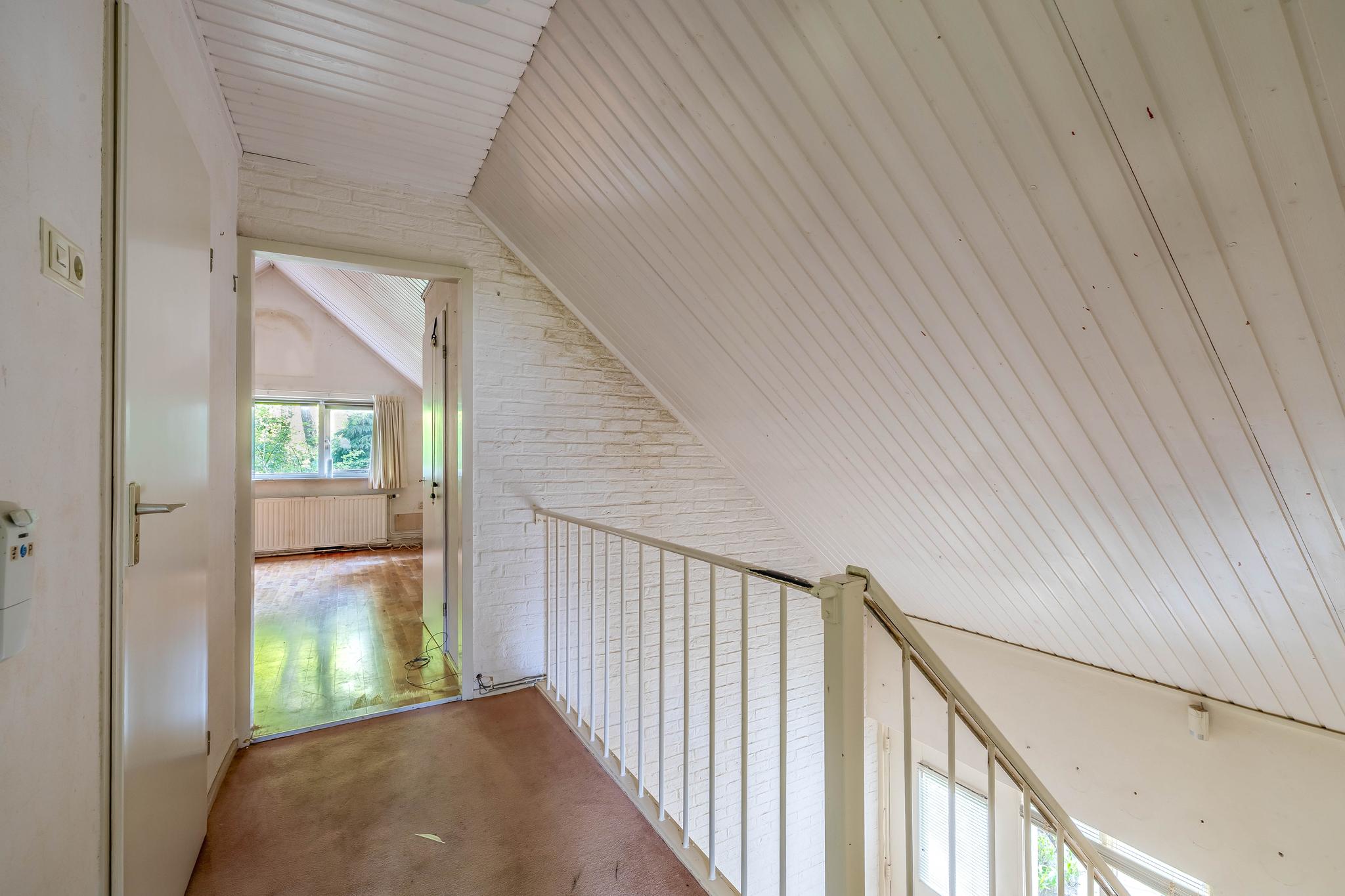 Verdieping: Overloop met toegang tot drie slaapkamers en de badkamer. Slaapkamer I heeft veel bergruimte achter knieschotten; slaapkamer II is voorzien van een wastafel; slaapkamer III heeft een vaste kast en tevens veel bergruimte achter knieschotten. De badkamer is voorzien van een douche en een toilet.