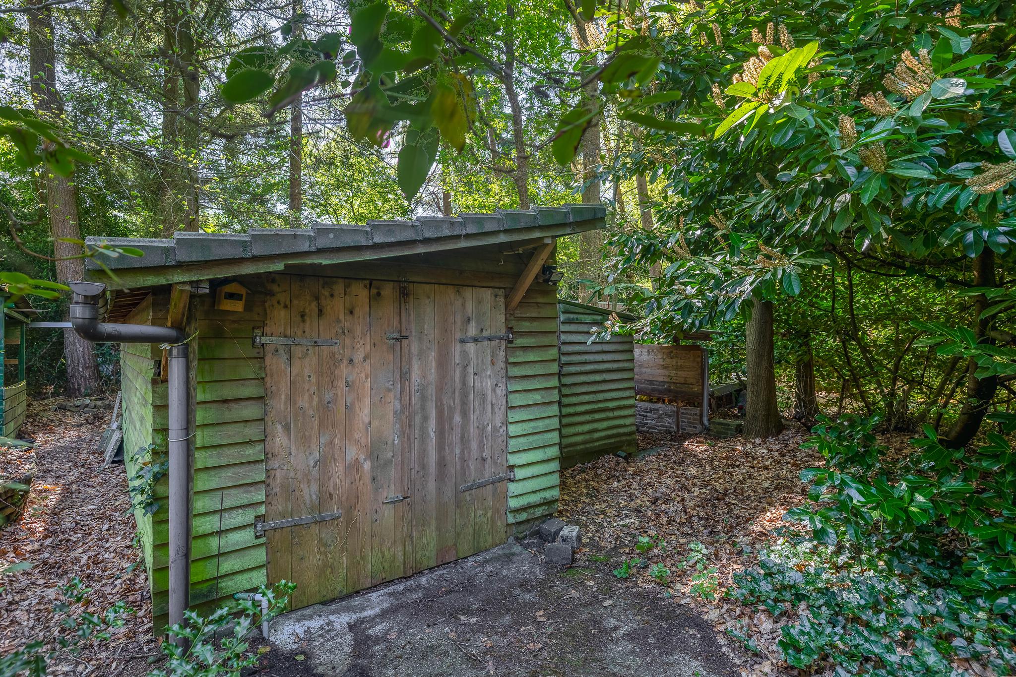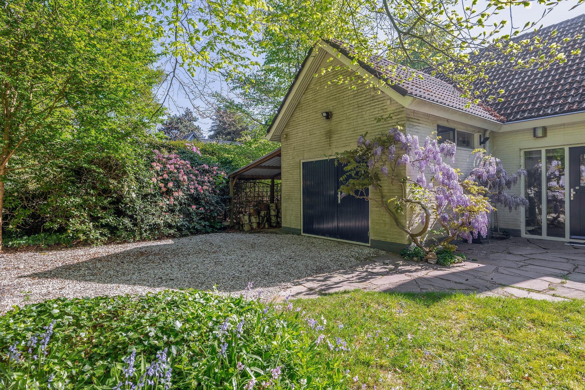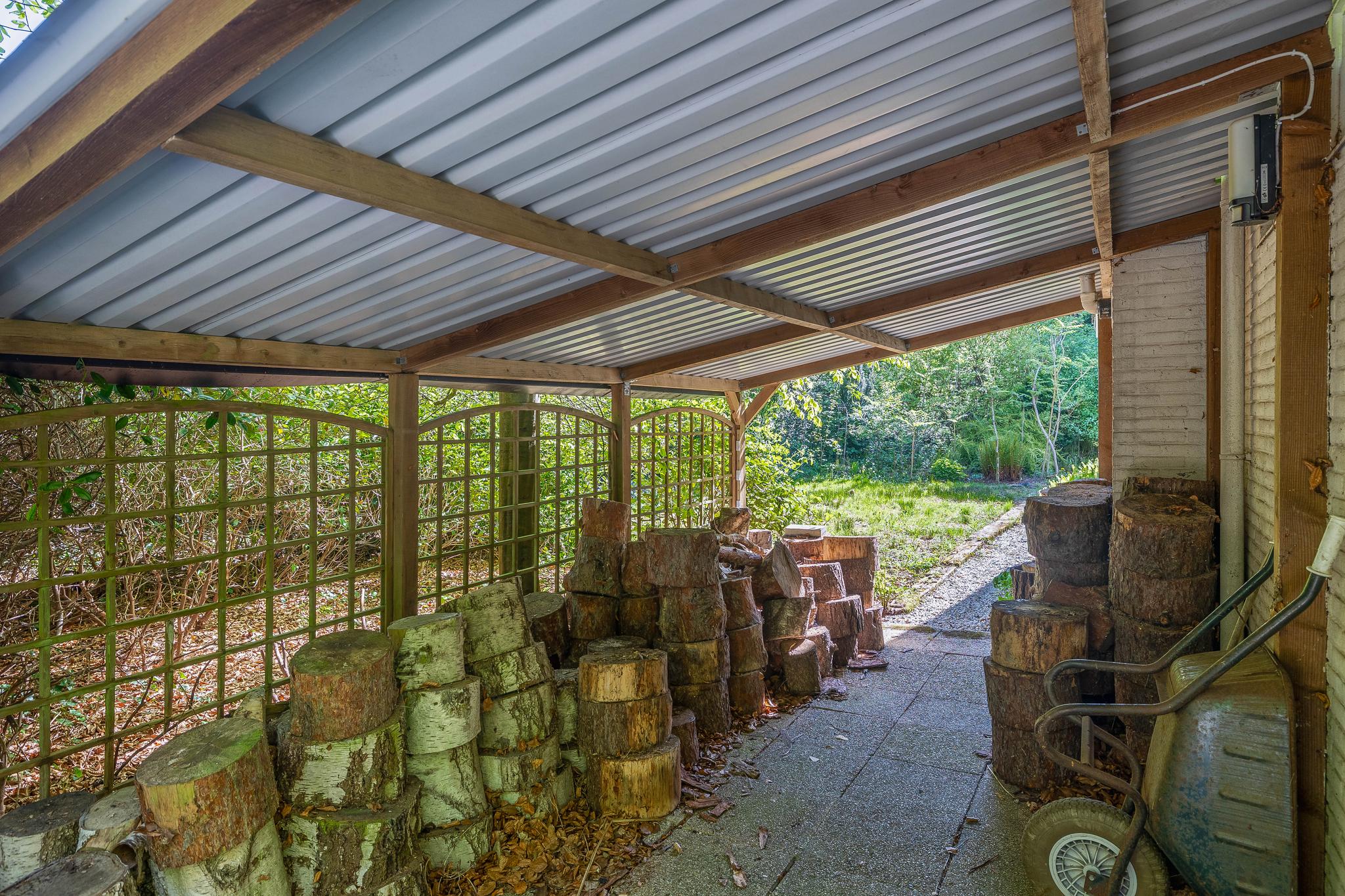 Aan de zijkant van het huis bevindt zich een carport/houtopslag. De fraai aangelegde tuin is rondom gelegen en voorzien van een vijverpartij en een plantenkas. Tevens bevinden zich nog enkele houten bergingen achter in de achtertuin.